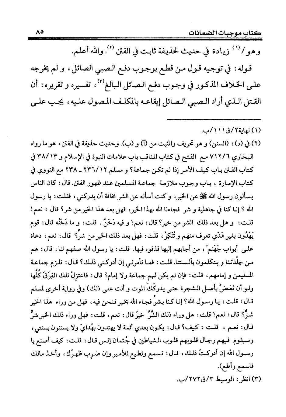 (¬2) في (د): (السنن) وهو تحريف والمثبت من (أ) و (ب). وحديث حذيفة في الفتن، هو ما رواه البخاري 6/ 712 مع الفتح في كتاب المناقب باب علامات النبوة في الإِسلام و13/ 38 في كتاب الفتن باب كيف الأمر إذا لم تكن جماعة؟ ومسلم 12/ 236 - 238 مع النووي في كتاب الإمارة، باب وجوب ملازمة جماعة المسلمين عند ظهور الفتن. قال: كان الناس يسألون رسول الله - صلى الله عليه وسلم - عن الخير، وكنت أسأله عن الشر مخافة أن يدركني، فقلت: يا رسول الله؟ انا كنا في جاهلية وشر فجاءنا الله بهذا الخير، فهل بعد هذا الخير من شر؟ قال: نعم! قلت: وهل بعد ذلك الشر من خير؟ قال: نعم! وفيه دَخَنٌ. قلت: وما دَخَنُه قال: قوم يَهْدُون بغير هَدْي تعرف منهم وتُنْكِرُ، قلت: فهل بعد ذلك الخير من شرًّ؟ قال: نعم، دعاة على أبواب جَهَنمَ، من أجابهم إليها قذفوه فيها. قلت: يا رسول الله صفهم لنا، قال: هم من جِلْدَتنا ويتكلمون بألسنتنا. قلت: فما تأمرني إن أدركني ذلك؟ قال: تلزم جماعة المسلمين وإمامهم، قلت: فإن لم يكن لهم جماعة ولا إمام؟ قال: فاعتزِلْ تلك الفِرَقَ كُلَّها ولو أن تَعَضَّ بأصل الشجرة حتى يدركَكَ الموت وأنت على ذلك) وفي رواية أخرى لمسلم قال: قلت: يا رسول الله؟ إنا كنا بشرًّ فجاء الله بخير فنحن فيه، فهل من وراء هذا الخير شرٌّ؟ قال: نعم! قلت: هل وراء ذلك الشَّرَّ خيرٌ قال: نعم، قلت: فهل وراء ذلك الخير شرٌّ قال: نعم، قلت: كيف؟ قال: يكون بعدي أئمة لا يهتدون بهُدايَ ولا يستنون بسنتي، وسيقوم فيهم رجال قلوبهم قلوب الشياطين في جُثمان إنس قال: قلت: كيف أصنع يا رسول الله إن أدركتُ ذلك، قال: تسمع وتطيع للأمير وإن ضرِب ظهرُك، وأخذ مالك فاسمع وأطع).