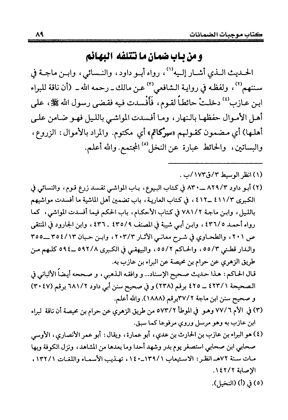 (¬2) أبو داود 3/ 829 - 830 في كتاب البيوع، باب المواشي تفسد زرع قوم، والنسائي في الكبرى 3/ 411 - 412، في كتاب العارية، باب تضمين أهل الماشية ما أفسدت مواشيهم بالليل، وابن ماجة 2/ 781 في كتاب الأحكام، باب الحكم فيما أفسدت المواشي، كما رواه أحمد 5/ 436، وابن أبي شيبة في المصنف 9/ 435 - 436، وابن الجارود في المنتقى ص 201، والطحاوي في شرح معاني الآثار 3/ 203، وابن حبان 13/ 354 - 355 والدارقطني 3/ 55، والحاكم 2/ 55، والبيهقي في الكبرى 8/ 592 - 594 كلهم من طريق الزهري عن حرام بن محيصة عن البراء بن عازب به.