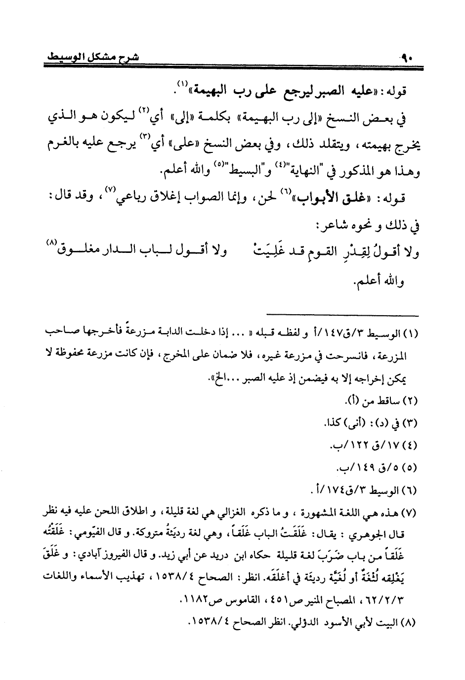 (¬1) الوسيط 3/ ق 147/ أولفظه قبله " ... إذا دخلت الدابة مزرعةً فأخرجها صاحب المزرعة، فانسرحت في مزرعة غيره، فلا ضمان على المخرج، فإن كانت مزرعة محفوظة لا يمكن إخراجه إلا به فيضمن إذ عليه الصبر ... إلخ".
