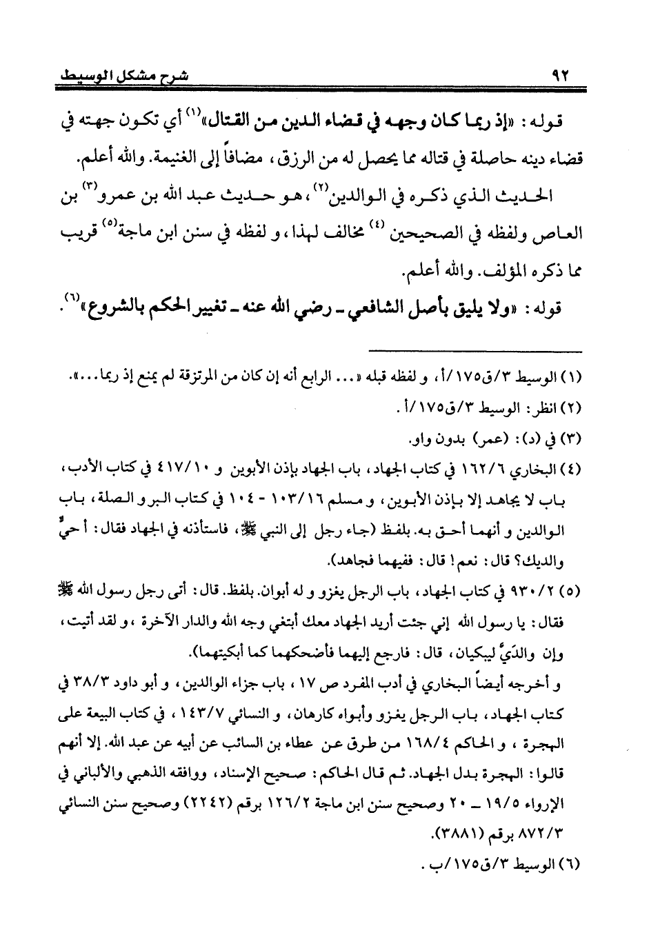 (¬4) البخاري 6/ 162 في كتاب الجهاد، باب الجهاد بإذن الأبوين و10/ 417 في كتاب الأدب، باب لا مجاهد إلا بإذن الأبوين، ومسلم 16/ 103 - 104 في كتاب البر والصلة، باب الوالدين وأنهما أحق به. بلفظ (جاء رجل إلى النبي - صلى الله عليه وسلم -، فاستأذنه في الجهاد فقال: أحيٌّ والديك؟ قال: نعم! قال: ففيهما فجاهد).