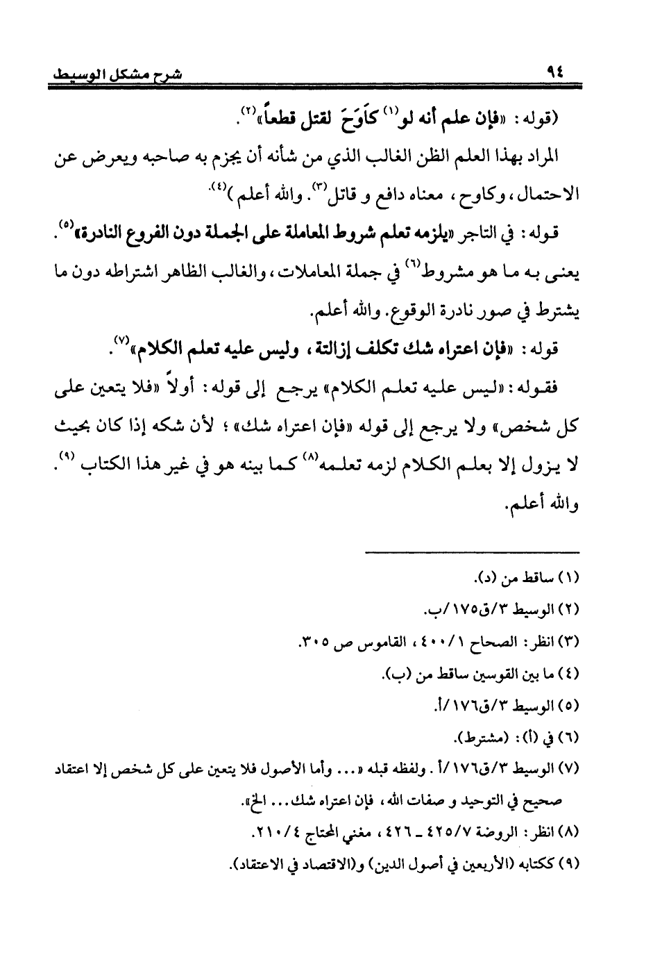 (¬7) الوسيط 3/ ق 176/ أ. ولفظه قبله " ... وأما الأصول فلا يتعين على كل شخص إلا اعتقاد صحيح في التوحيد وصفات الله، فإن اعتراه شك ... إلخ".