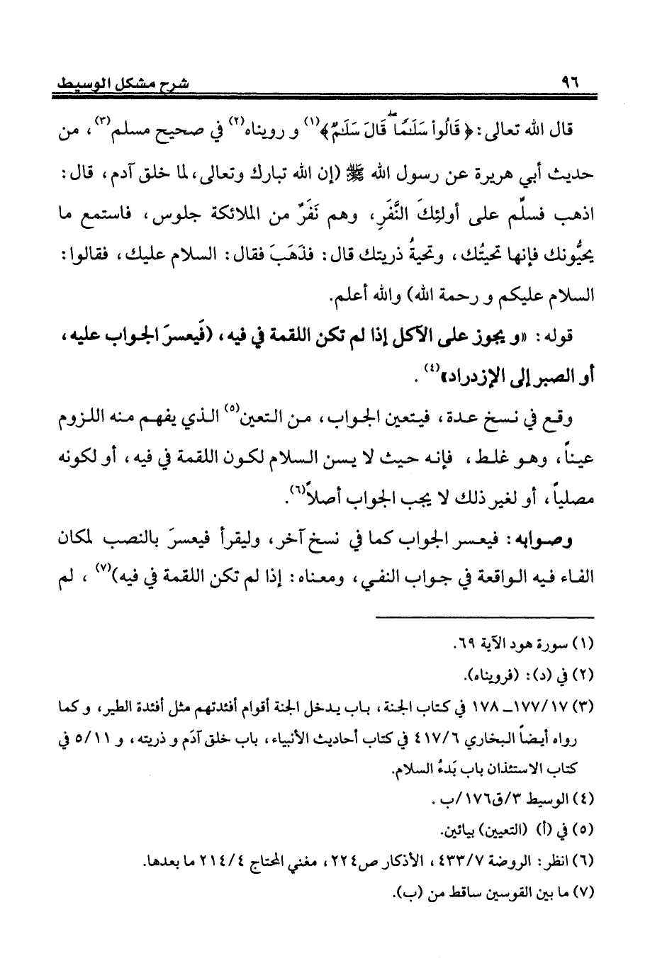 قوله: "ويجوز على الآكل إذا لم تكن اللقمة في فيه، (فَيعسرَ الجواب عليه، أو الصبر إلى الإزدراد" (¬4).