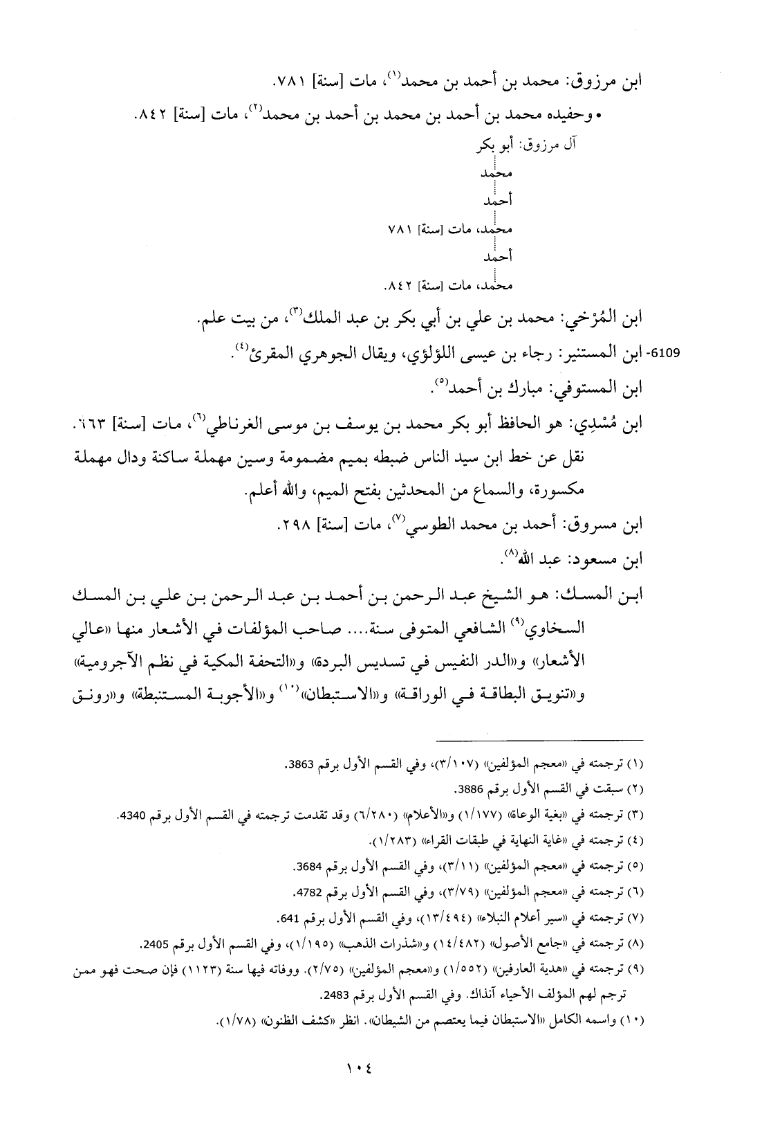 ابن المسك: هو الشيخ عبد الرحمن بن أحمد بن عبد الرحمن بن علي بن المسك السخاوي (¬9) الشافعي المتوفى سنة .... صاحب المؤلفات في الأشعار منها "عالي الأشعار" و"الدر النفيس في تسديس البردة" و"التحفة المكية في نظم الآجرومية" و"تنويق البطاقة في الوراقة" و"الاستبطان" (¬10) و"الأجوبة المستنبطة" و"رونق