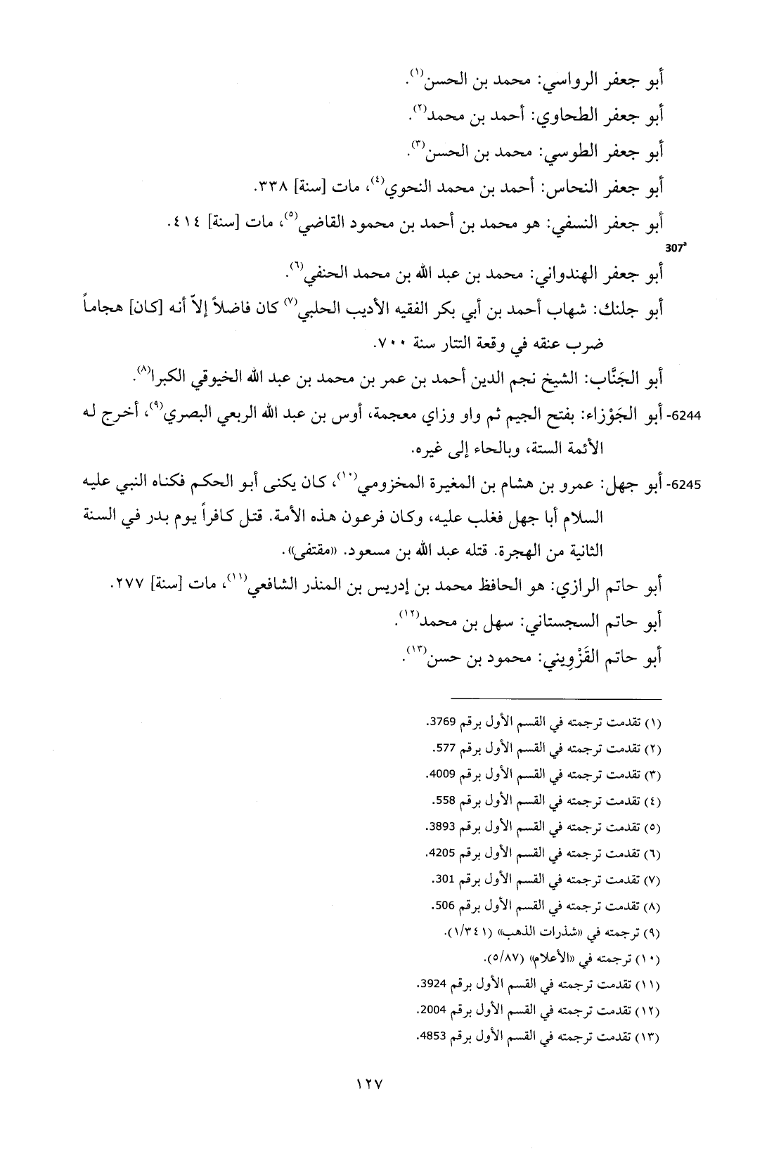 6245 - أبو جهل: عمرو بن هشام بن المغيرة المخزومي (¬10)، كان يكنى أبو الحكم فكناه النبي -عليه السلام- أبا جهل فغلب عليه، وكان فرعون هذه الأمة. قتل كافرًا يوم بدر في السنة الثانية من الهجرة. قتله عبد الله بن مسعود. "مقتفى".