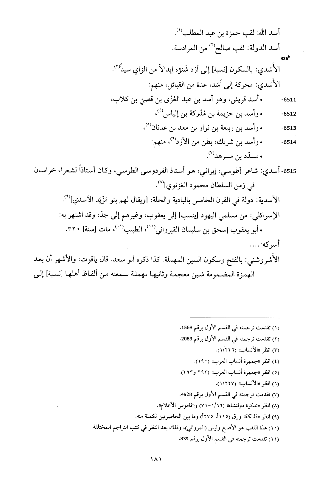 6515 - أسدي: شاعر [طوسي، إيراني، هو أستاذ الفردوسي الطوسي، وكان أستاذاً لشعراء خراسان في زمن السلطان محمود الغزنوي] (¬8).