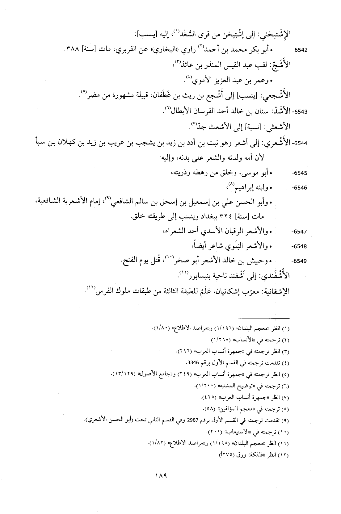6544 - الأَشْعري: إلى أشعر وهو نبت بن أدد بن زيد بن يشجب بن عريب بن زيد بن كهلان بن سبأ لأن أمه ولدته والشعر على بدنه، وإليه: