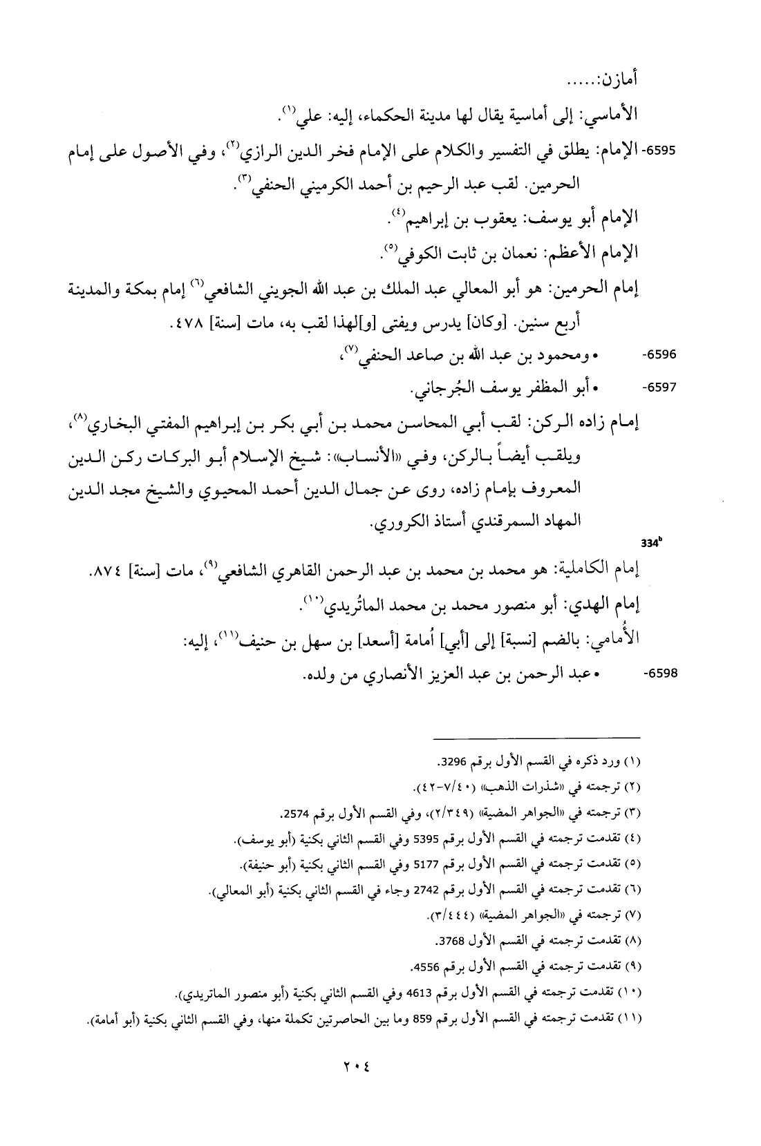6595 - الإمام: يطلق في التفسير والكلام على الإمام فخر الدين الرازي (¬2)، وفي الأصول على إمام الحرمين. لقب عبد الرحيم بن أحمد الكرميني الحنفي (¬3).