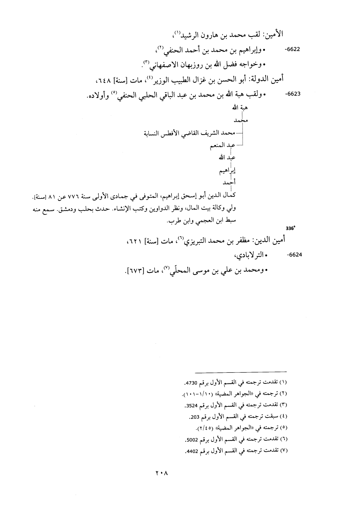 6623 - • ولقب هبة الله بن محمد بن عبد الباقي الحلبي الحنفي (¬5) وأولاده.