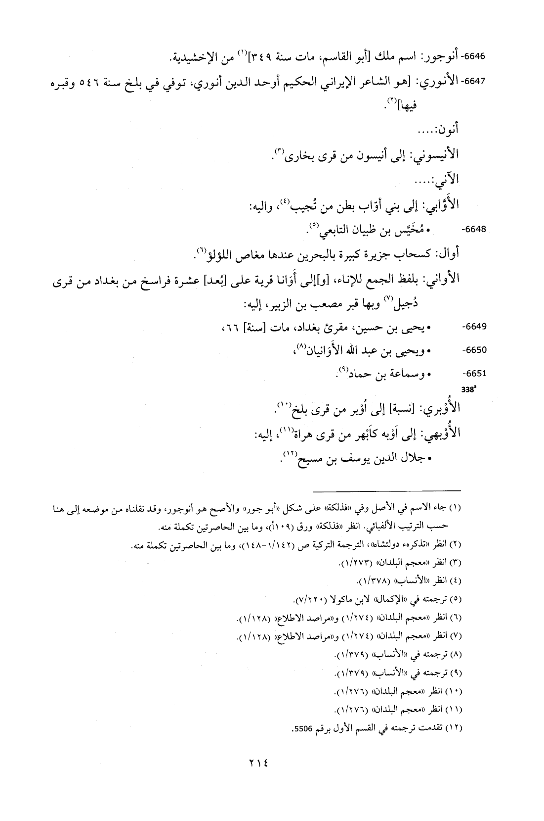 6647 - الأنوري: [هو الشاعر الإيراني الحكيم أوحد الدين أنوري، توفي في بلخ سنة 546 وقبره فيها] (¬2).