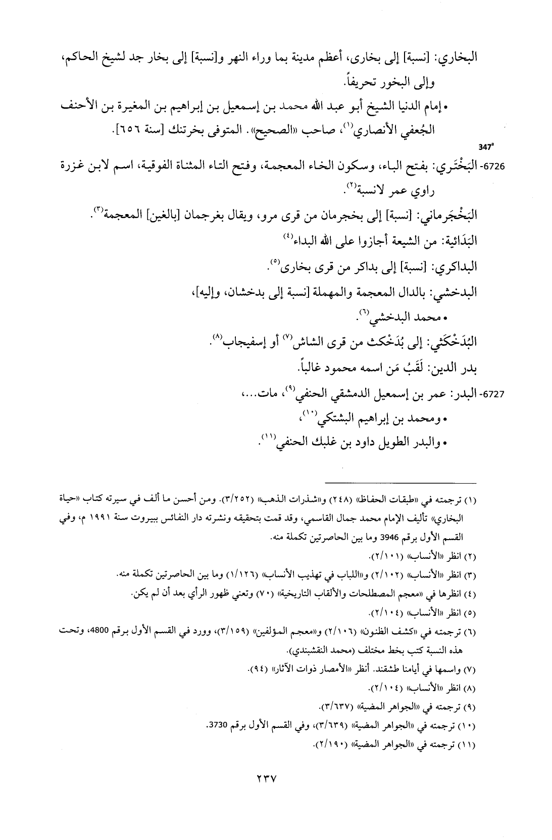 البخاري: [نسبة] إلى بخارى، أعظم مدينة بما وراء النهر و [نسبة] إلى بخار جد لشيخ الحاكم، وإلى البخور تحريفًا.