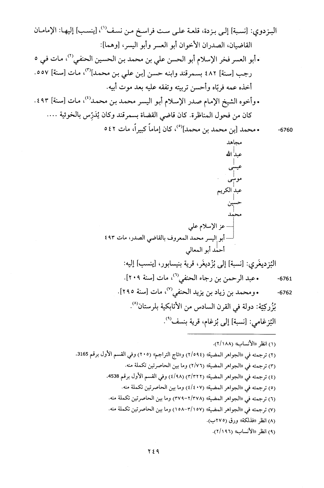 • أبو العسر فخر الإسلام أبو الحسن علي بن محمد بن الحسين الحنفي (¬2)، مات في 5 رجب [سنة] 482 بسمرقند وابنه حسن [بن علي بن محمد] (¬3)، مات [سنة] 557 • أخذه عمه فربّاه وأحسن تربيته وتفقه عليه بعد موت أبيه.