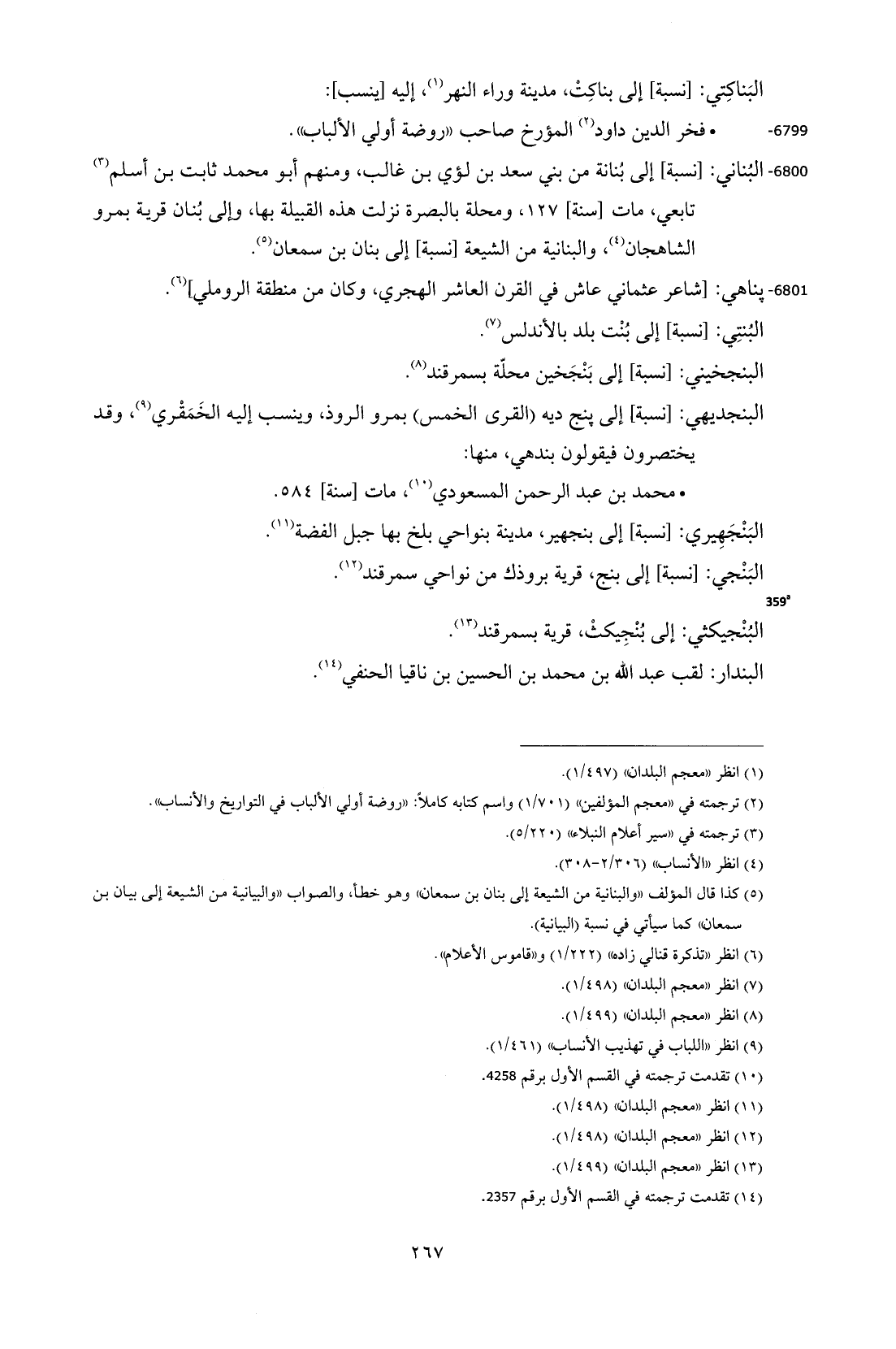6800 - البُناني: [نسبة] إلى بُنانة من بني سعد بن لؤي بن غالب، ومنهم أبو محمد ثابت بن أسلم (¬3)