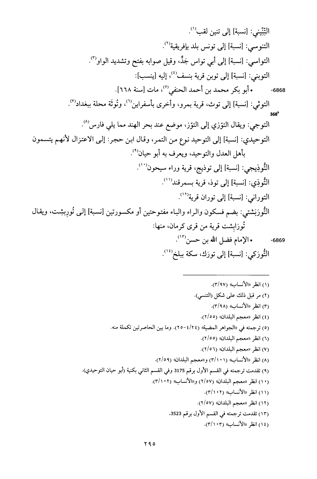 التوبني: [نسبة] إلى توبن قرية بنسف (¬4)، إليه [ينسب]:
