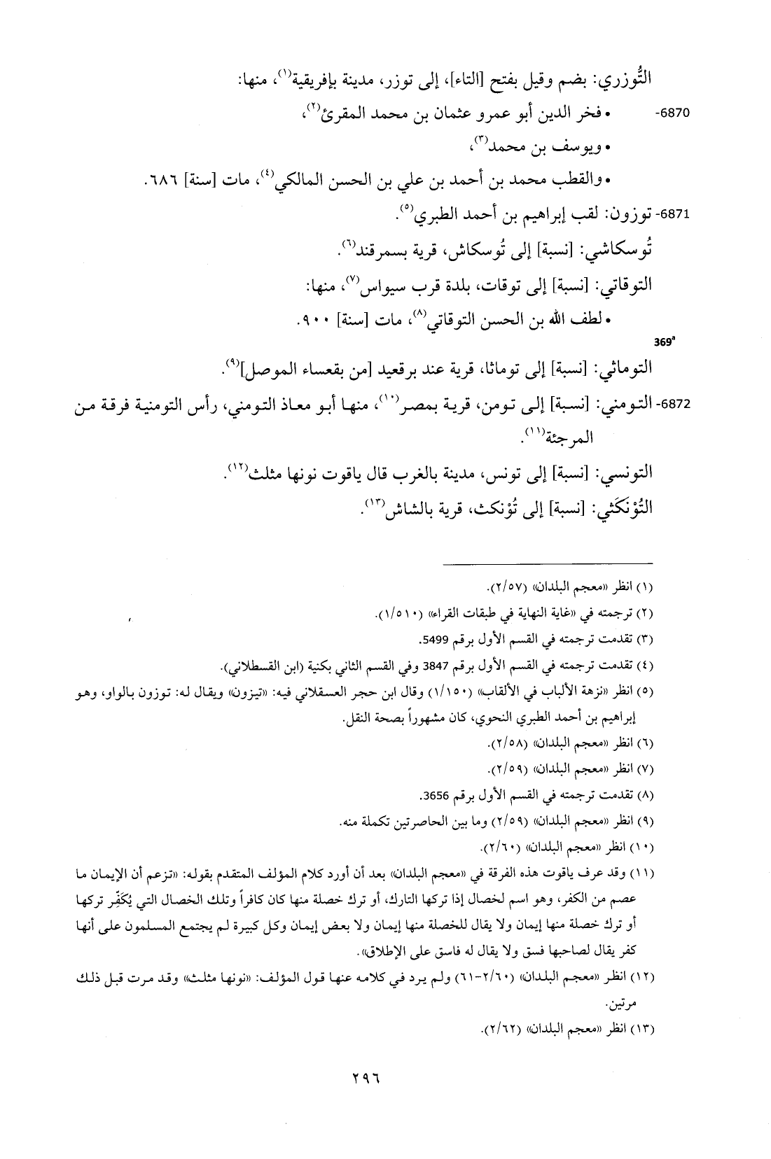 6872 - التومني: [نسبة] إلى تومن، قرية بمصر (¬10)، منها أبو معاذ التومني، رأس التومنية فرقة من المرجئة (¬11).