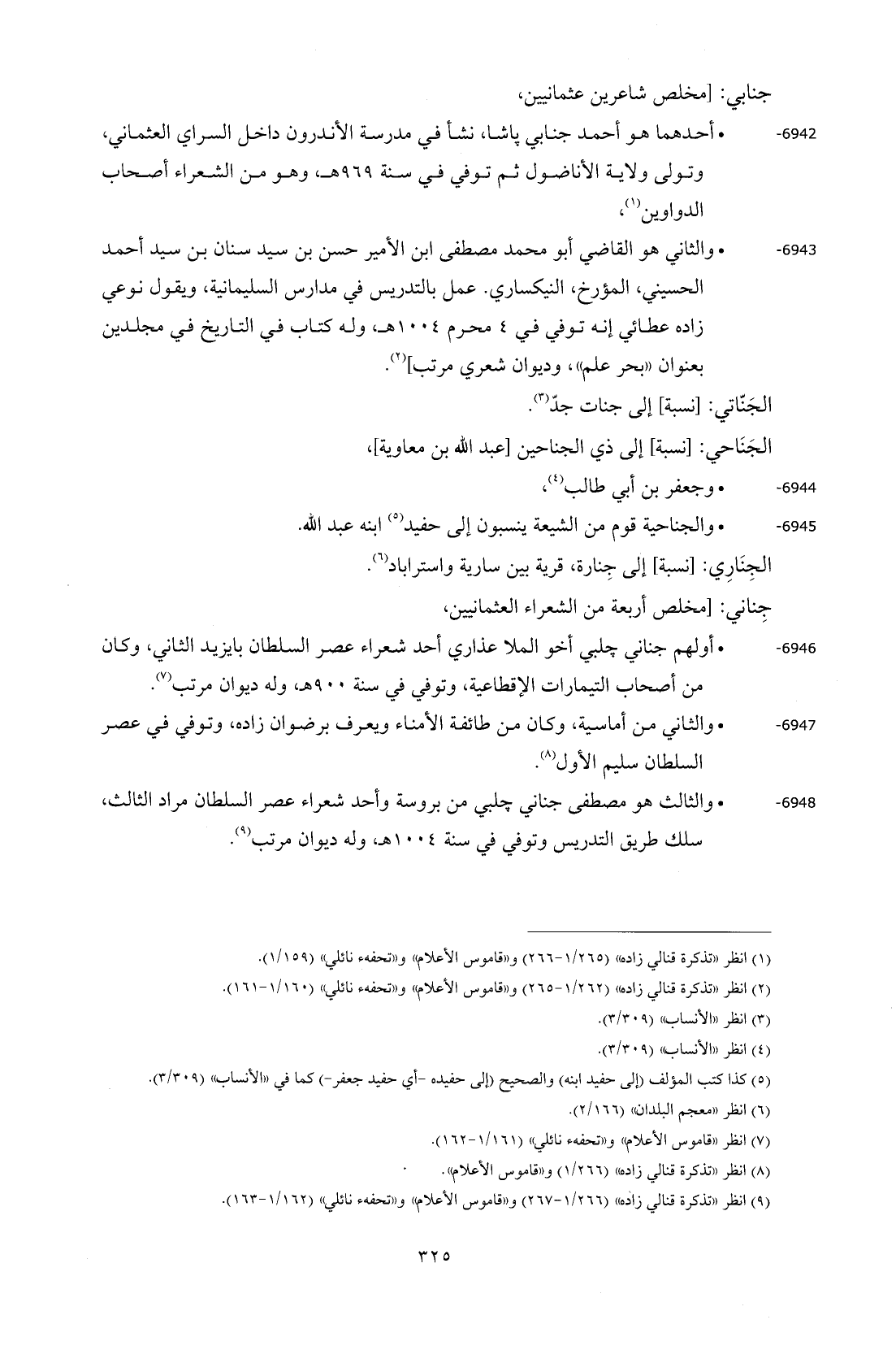 6946 - • أولهم جناني جلبي أخو الملا عذاري أحد شعراء عصر السلطان بايزيد الثاني، وكان من أصحاب التيمارات الإقطاعية، وتوفي في سنة 900 هـ، وله ديوان مرتب (¬7).