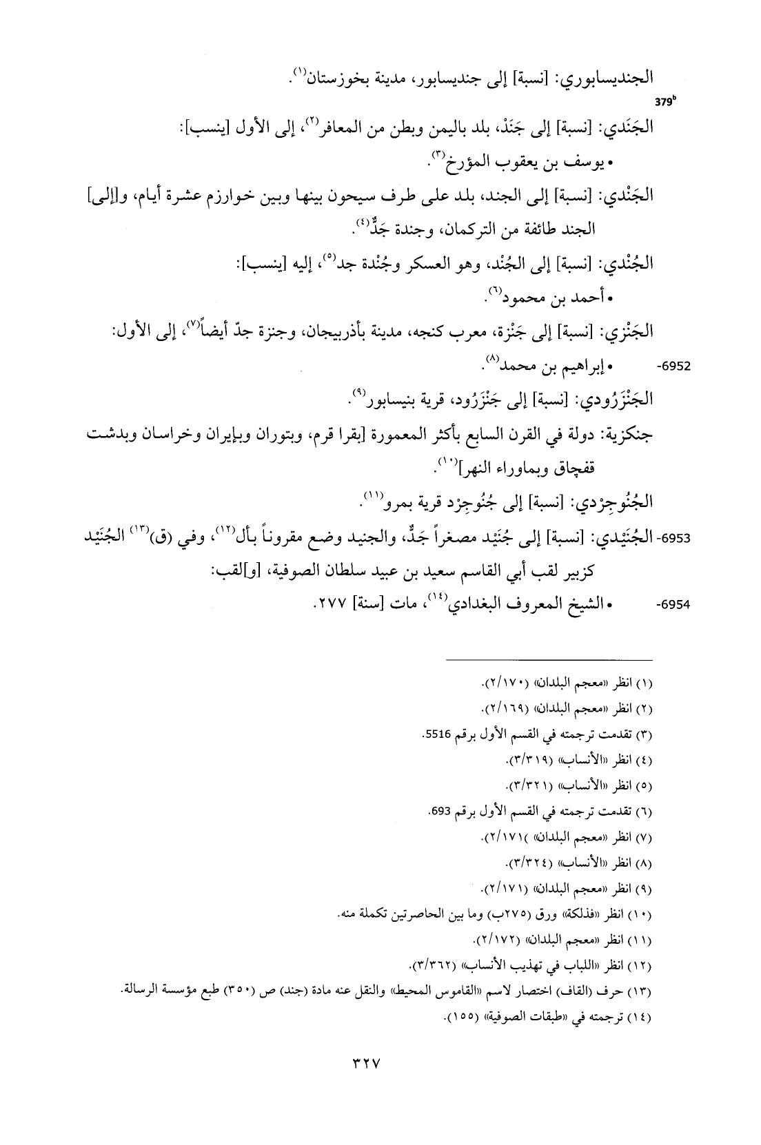 6953 - الجُنَيْدي: [نسبة] إلى جُنَيْد مصغرًا جَدٌّ، والجنيد وضع مقرونًا بال (¬12)، وفي (ق) (¬13) الجُنَيْد كزبير لقب أبي القاسم سعيد بن عبيد سلطان الصوفية، [و] لقب:
