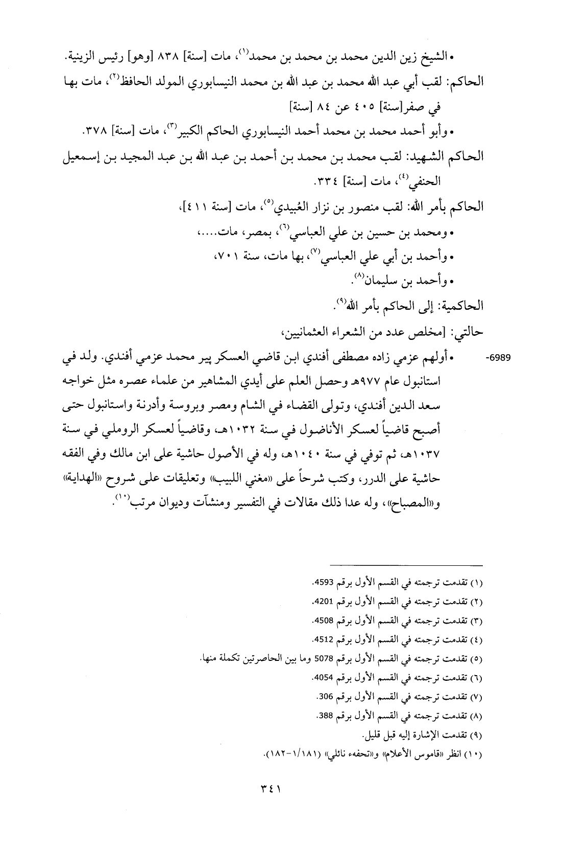 الحاكم: لقب أبي عبد الله محمد بن عبد الله بن محمد النيسابوري المولد الحافظ (¬2)، مات بها في صفر [سنة] 405 عن 84 [سنة]