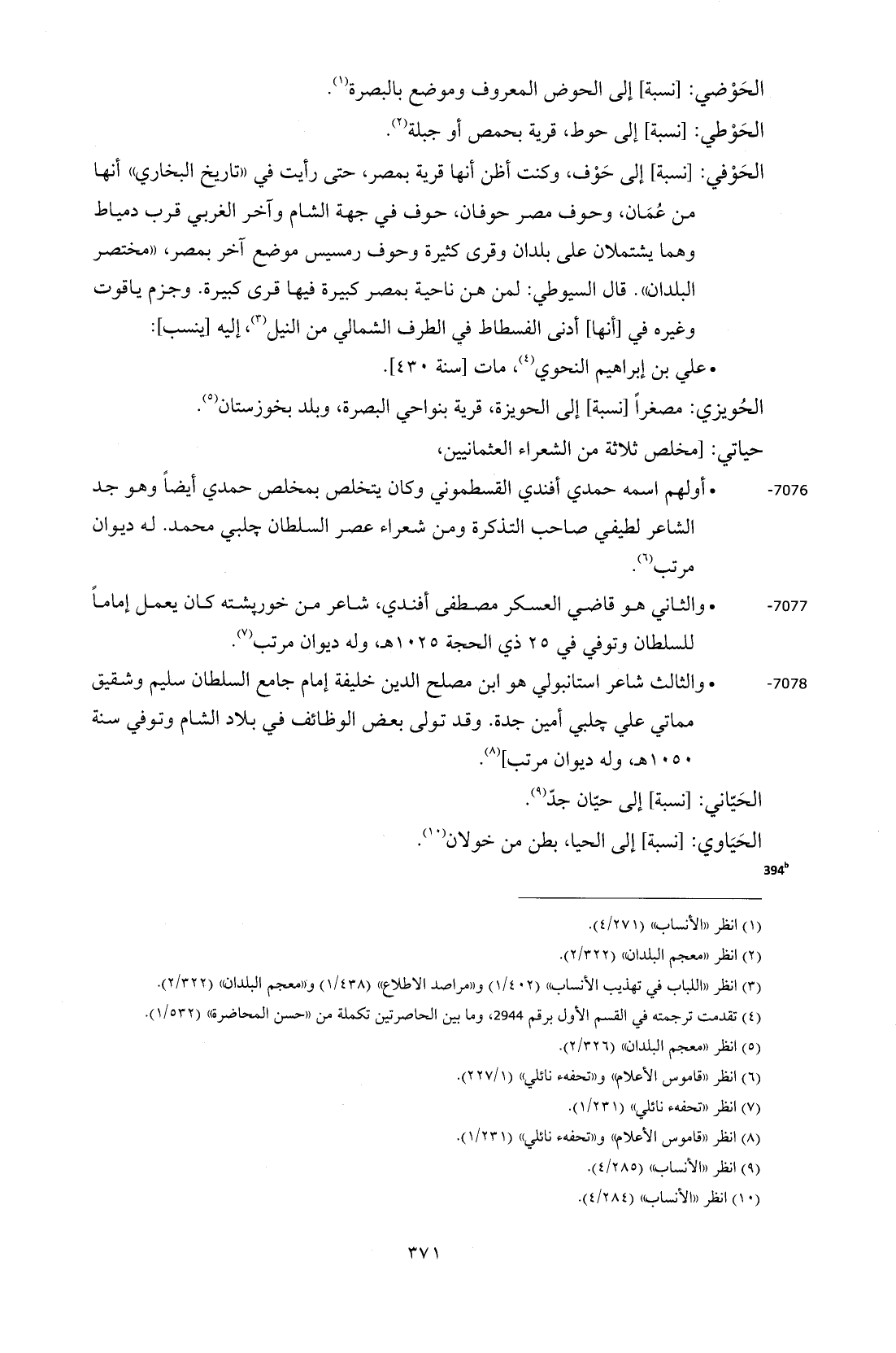 الحَوْفي: [نسبة] إلى حَوْف، وكنت أظن أنها قرية بمصر، حتى رأيت في "تاريخ البخاري) أنها من عُمَان، وحوف مصر حوفان، حوف في جهة الشام وآخر الغربي قرب دمياط وهما يشتملان على بلدان وقرى كثيرة وحوف رمسيس موضع آخر بمصر، "مختصر البلدان". قال السيوطي: لمن هن ناحية بمصر كبيرة فيها قرى كبيرة. وجزم ياقوت وغيره في [أنها] أدنى الفسطاط في الطرف الشمالي من النيل (¬3)، إليه [ينسب]: