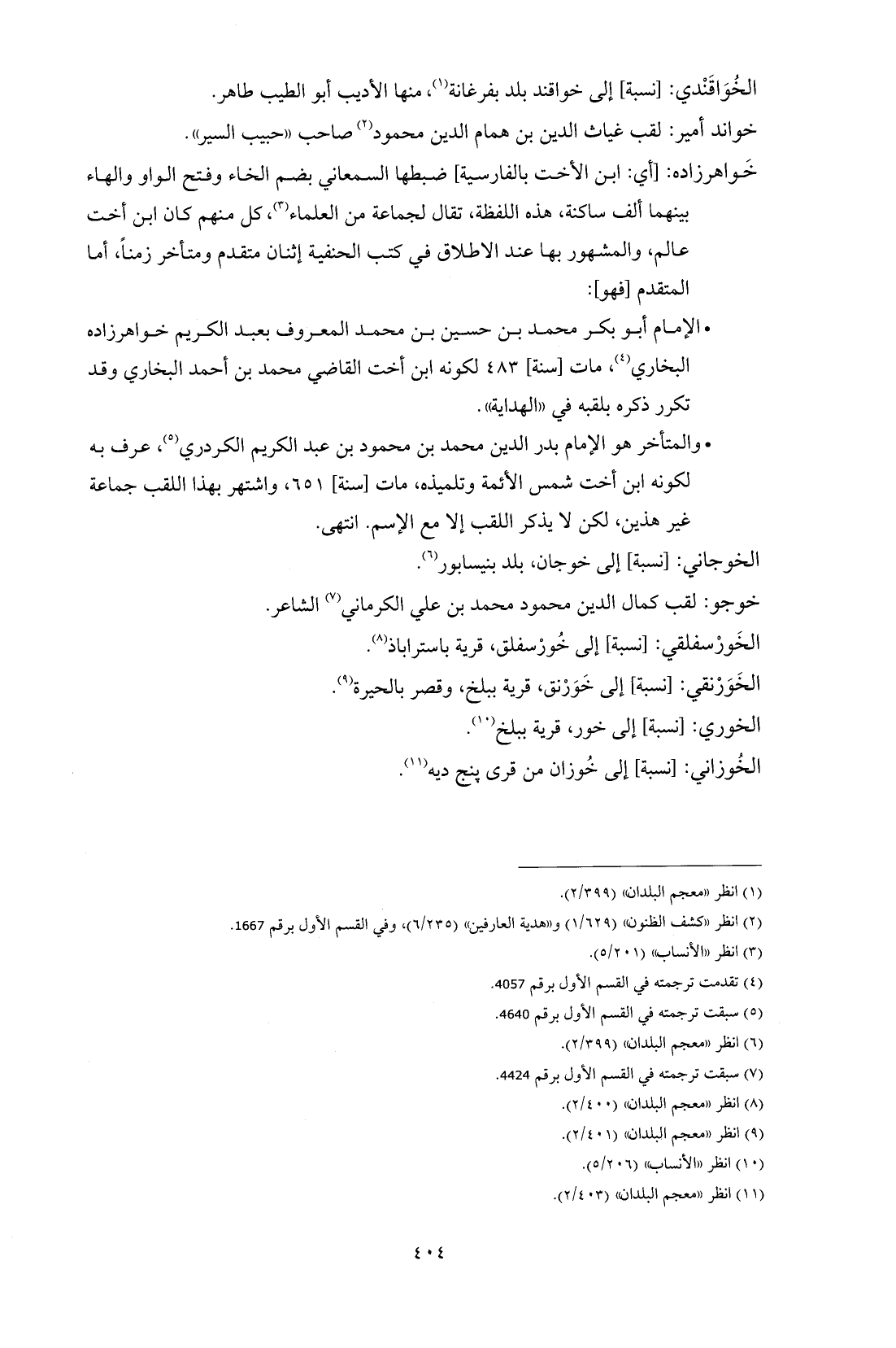 خَواهرزاده: [أي: ابن الأخت بالفارسية] ضبطها السمعاني بضم الخاء وفتح الواو والهاء بينهما ألف ساكنة، هذه اللفظة، تقال لجماعة من العلماء (¬3)، كل منهم كان ابن أخت عالم، والمشهور بها عند الاطلاق في كتب الحنفية إثنان متقدم ومتأخر زمنًا، أما المتقدم [فهو]: