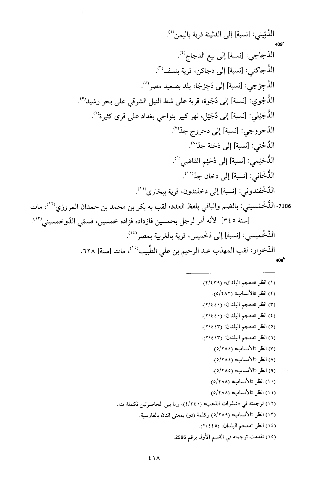 7186 - الدُّخَمْسيني: بالضم والباقي بلفظ العدد، لقب به بكر بن محمد بن حمدان المروزي (¬12)، مات [سنة 345]. لأنه أمر لرجل بخمسين فازداده فزاده خمسين، فسمّي الدّوخمسيني (¬13).