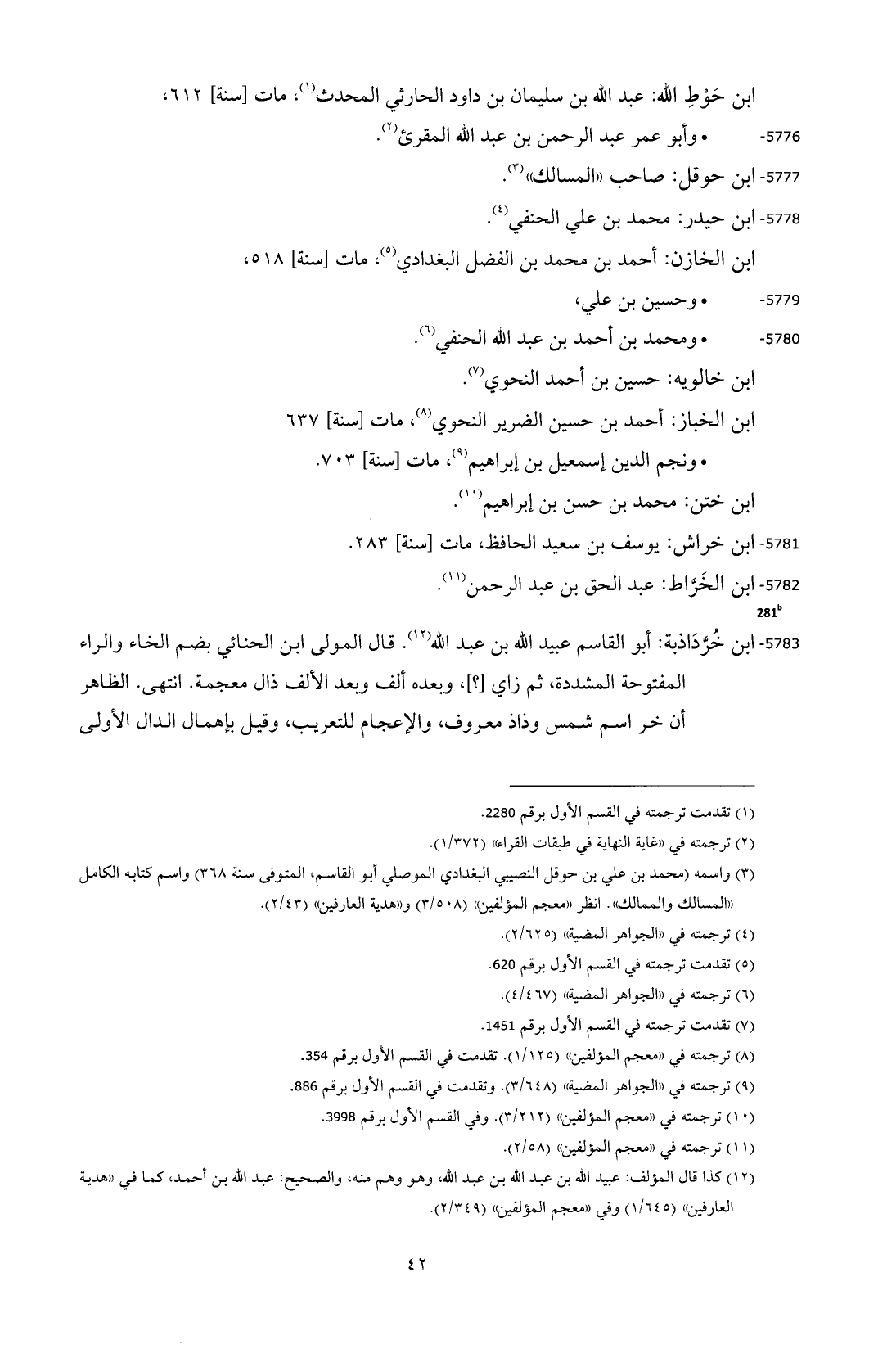 5783 - ابن خُرَّدَاذبة: أبو القاسم عبيد الله بن عبد الله (¬12). قال المولى ابن الحنائي بضم الخاء والراء المفتوحة المشددة، ثم زاي [؟ ]، وبعده ألف وبعد الألف ذال معجمة. انتهى. الظاهر أن خر اسم شمس وذاذ معروف، والإعجام للتعريب، وقيل بإهمال الدال الأولى