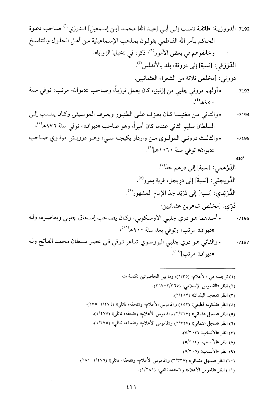 7192 - الدروزية: طائفة تنسب إلى أبي [عبد الله] محمد [بن إسمعيل] الدرزي (¬1) صاحب دعوة الحاكم بأمر الله الفاطمي يقولون بمذهب الإسماعيلية من أهل الحلول والتناسخ وخالفوهم في بعض الأمور (¬2)، ذكره في "خبايا الزوايا".
