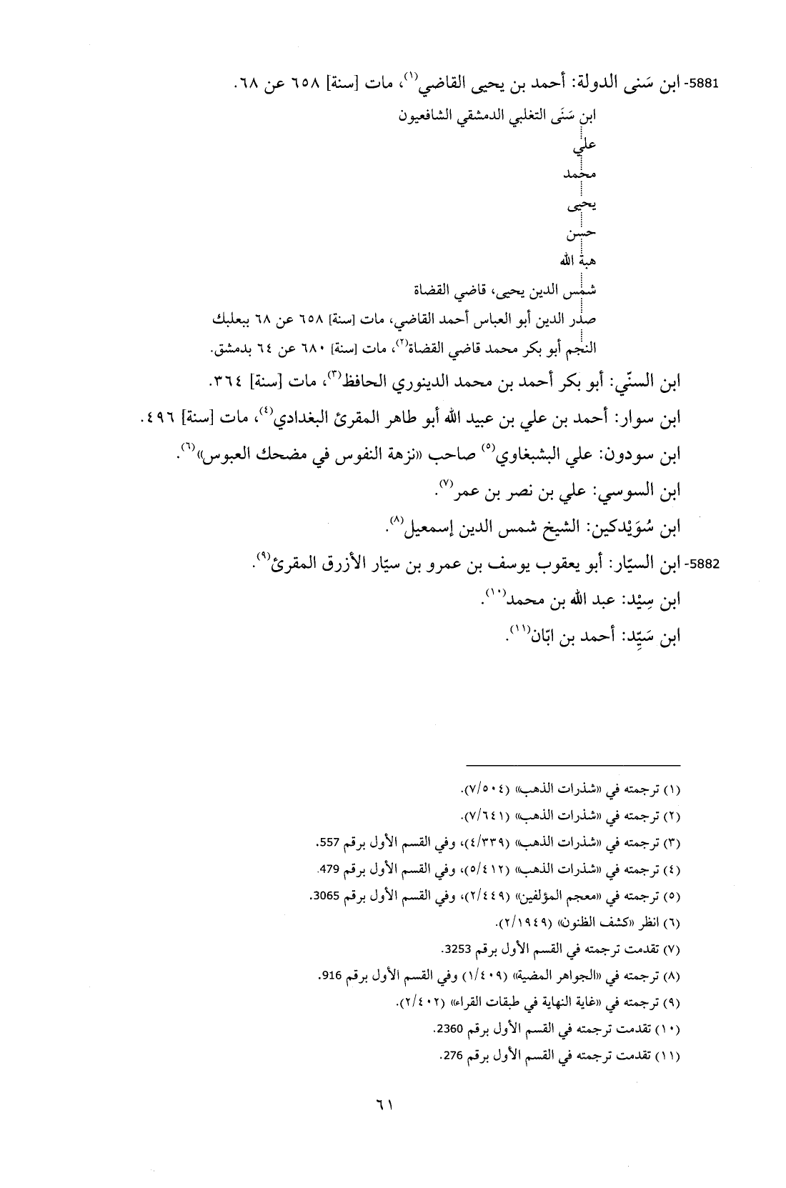 5881 - ابن سَنى الدولة: أحمد بن يحيى القاضي (¬1)، مات [سنة] 658 عن 68.