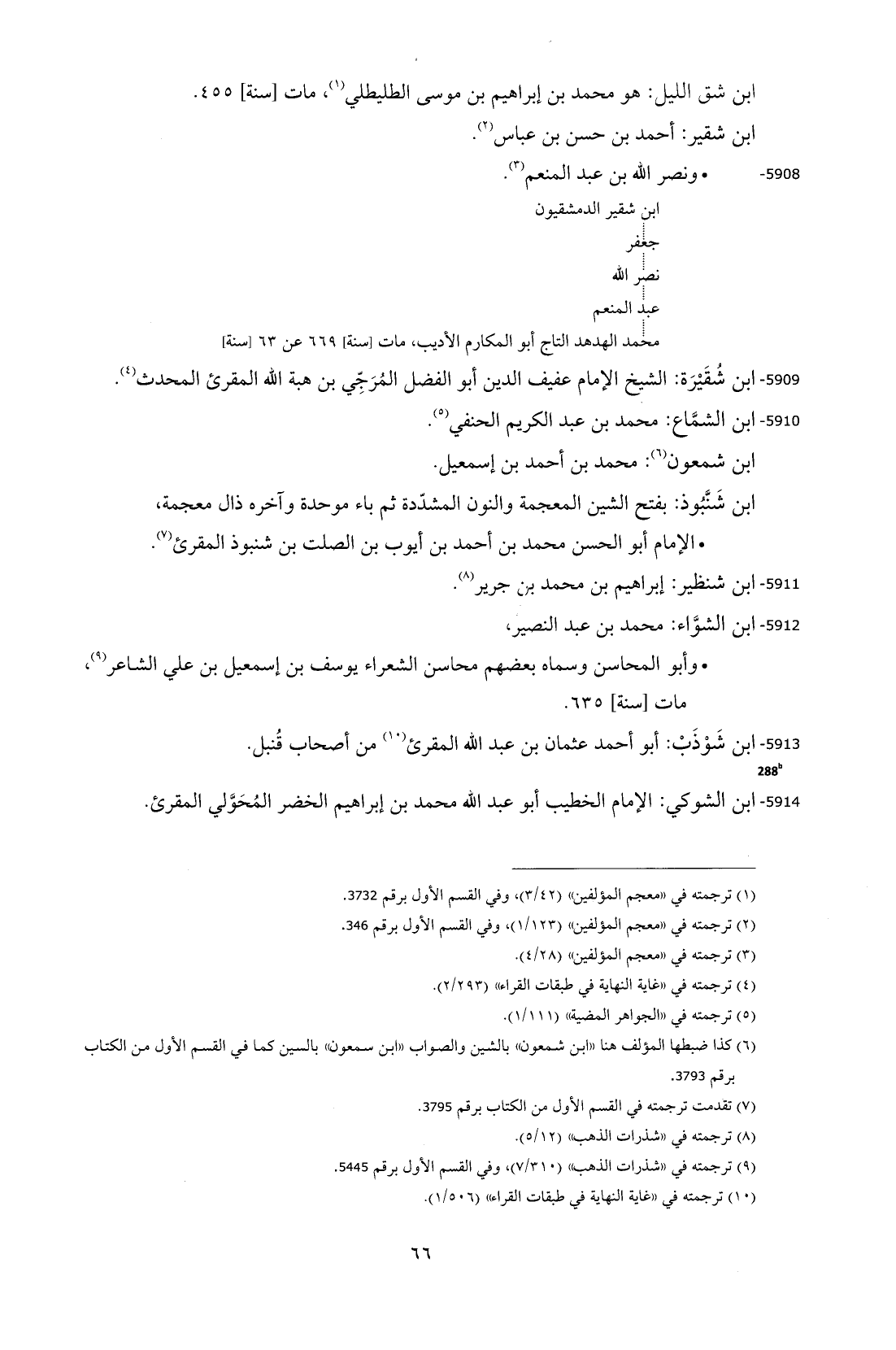 5909 - ابن شُقَيْرَة: الشيخ الإمام عفيف الدين أبو الفضل المُرَجِّي بن هبة الله المقرئ المحدث (¬4).