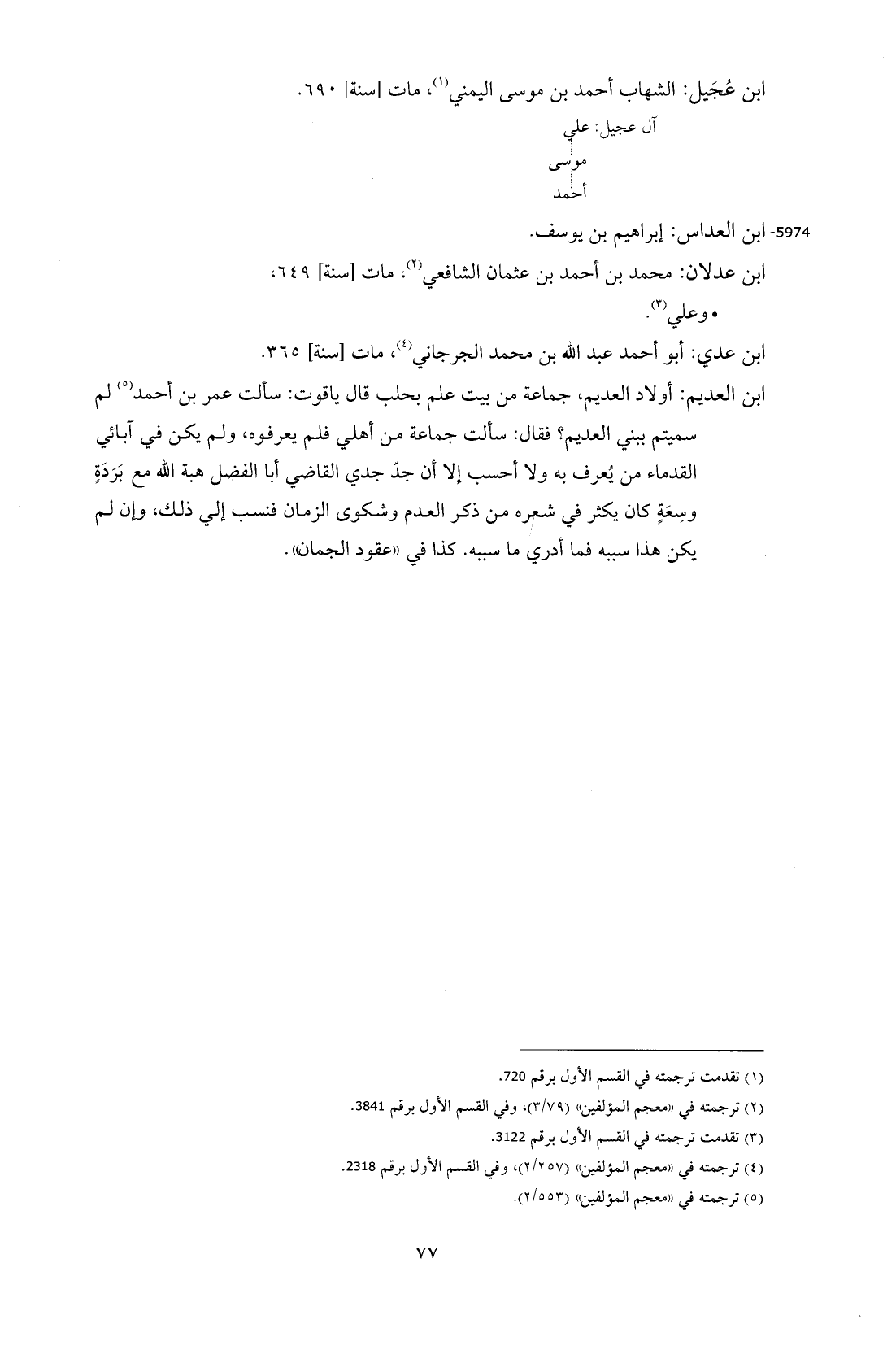 ابن العديم: أولاد العديم، جماعة من بيت علم بحلب قال ياقوت: سألت عمر بن أحمد (¬5) لم سميتم ببني العديم؟ فقال: سألت جماعة من أهلي فلم يعرفوه، ولم يكن في آبائي القدماء من يُعرف به ولا أحسب إلا أن جدّ جدي القاضي أبا الفضل هبة الله مع بَرَدَةٍ وسِعَةٍ كان يكثر في شعره من ذكر العدم وشكوى الزمان فنسب إلي ذلك، وإن لم يكن هذا سببه فما أدري ما سببه. كذا في "عقود الجمان".