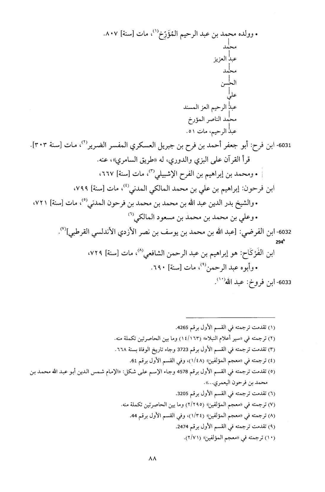 (¬5) تقدمت ترجمته في القسم الأول برقم 4578 وجاء الإسم على شكل: "الإمام شمس الدين أبو عبد الله محمد بن محمد بن فرحون اليعمري ... ".