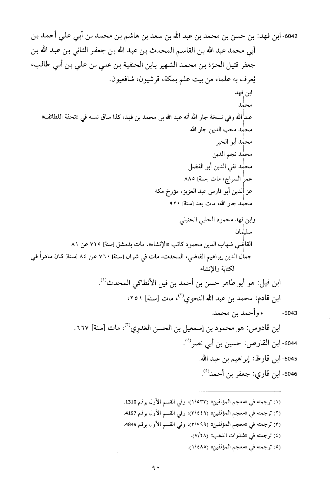 6042 - ابن فهد: بن حسن بن محمد بن عبد الله بن سعد بن هاشم بن محمد بن أبي علي أحمد بن أبي محمد عبد الله بن القاسم المحدث بن عبد الله بن جعفر الثاني بن عبد الله بن جعفر قتيل الحرّة بن محمد الشهير بابن الحنفية بن علي بن علي بن أبي طالب، يُعرف به علماء من بيت علم بمكة، قرشيون، شافعيون.