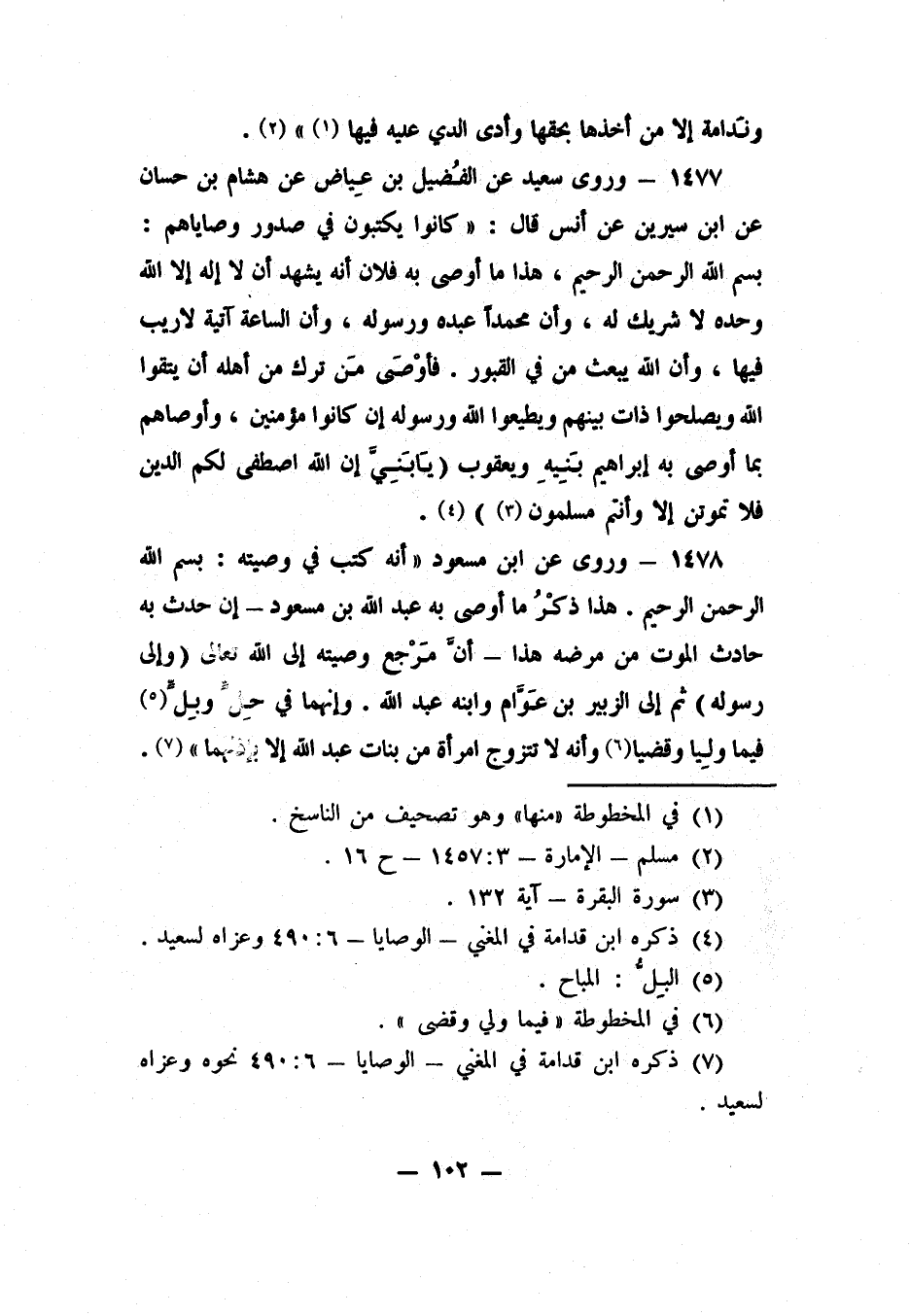 1477- وروى سعيد عن الفُضيل بن عِياض عن هشام بن حسان عن ابن سيرين عن أنس قال: "كانوا يكتبون في صدور وصاياهم: بسم الله الرحمن الرحيم. هذا ما أوصى به فلان: أنه يشهد أن لا إله إلا الله وحده لا شريك له، وأن محمداً عبده ورسوله، وأن الساعة آتية لا ريب فيها، وأن الله يبعث من في القبور. فأوْصَى مَن ترك من أهله أن يتقوا الله، ويصلحوا ذات بينهم، ويطيعوا الله ورسوله إن كانوا مؤمنين، وأوصاهم بما أوصى به إبراهيم بَنِيهِ ويعقوب: {يَا بَنِيَّ إِنَّ اللَّهَ اصْطَفَى لَكُمُ الدِّينَ فَلا تَمُوتُنَّ إِلاَّ وَأَنْتُمْ مُسْلِمُونَ} " 3.