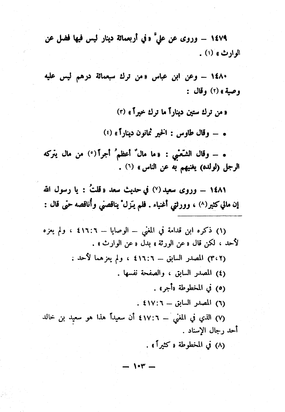 1480- وعن ابن عباس: "من ترك سبعمائة درهم، ليس عليه وصية" 2. وقال: "من ترك ستين ديناراً، ما ترك خيراً" 3.