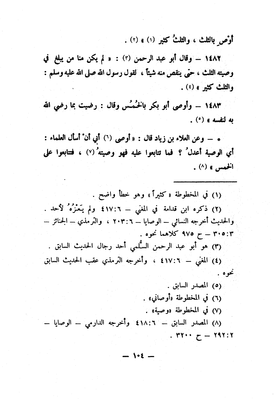 1482- وقال أبو عبد الرحمن: 3 "لم يكن منا من يبلغ في وصيته الثلث حتى ينقص منه شيئاً، لقول رسول الله صلى الله عليه وسلم: والثلث كثير" 4.