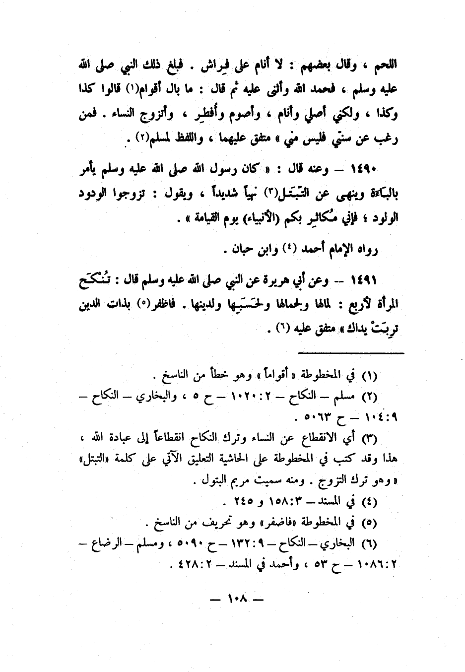 1491- وعن أبي هريرة عن النبي صلى الله عليه وسلم قال: "تُنكح المرأة لأربع: لمالها، ولجمالها، ولحَسَبِها، ولدينها. فاظفر 5 بذات الدين ترِبَتْ يداك". متفق عليه 6.