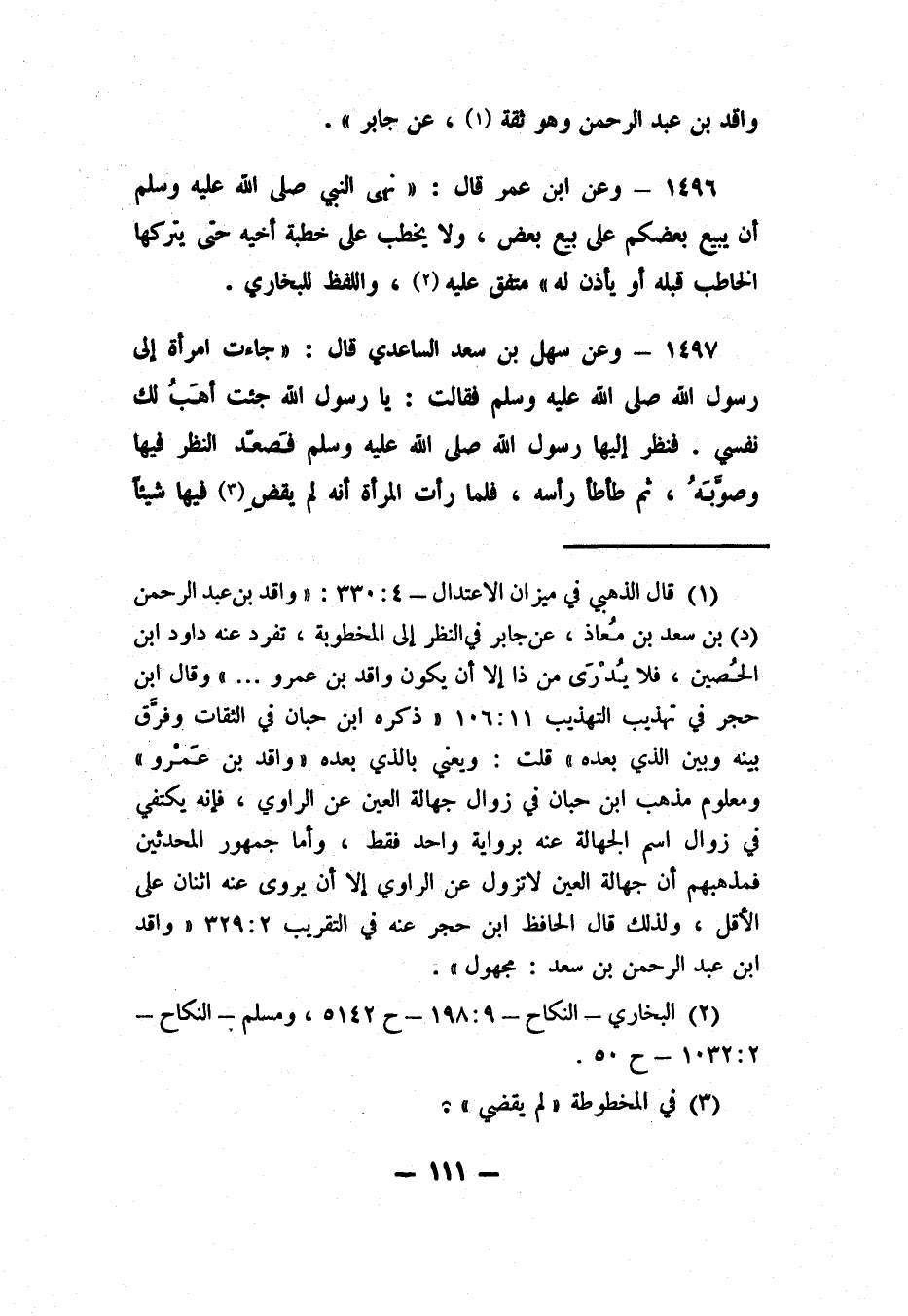 1 قال الذهبي في ميزان الاعتدال (4/330) : "واقد بن عبد الرحمن (د) بن سعد بن معاذ, عن جابر في النظر إلى المخطوبة, تفرد عنه داود بن الحصين, فلا يدرى من ذا إلا أن يكون واقد بن عمرو ... ". وقال ابن حجر في تهذيب التهذيب (11/106) : ذكره ابن حبان في الثقات، وفرق بينه وبين الذي بعده. قلت: ويعني بالذي بعده: واقد بن عمرو. ومعلوم مذهب ابن حبان في زوال جهالة العين عن الراوي, فإنه يكتفي في زوال اسم الجهالة عنه برواية واحد فقط, وأما جمهور المحدثين فمذهبهم أن جهالة العين لا تزول عن الراوي إلا أن يروي عنه اثنان على الأقل, ولذلك قال الحافظ ابن حجر عنه في التقريب (2/329) : واقد بن عبد الرحمن بن سعد: مجهول.