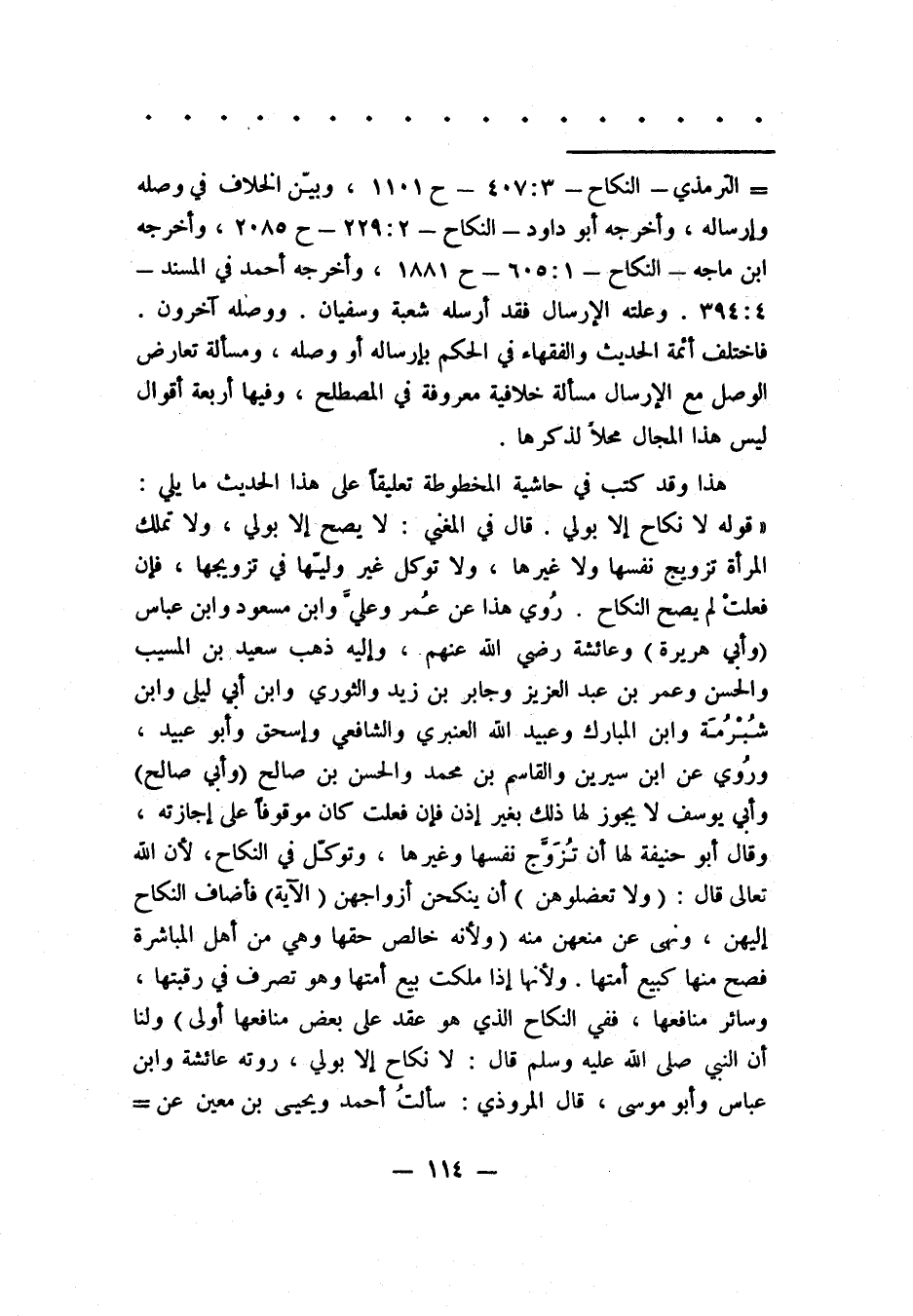 = الترمذي: النكاح (3/407) ح (1101) , وبين الخلاف في وصله وإرساله, وأخرجه أبو داود: النكاح (2/229) ح (2085) , وأخرجه ابن ماجة: النكاح (1/605) ح (1881) , وأخرجه أحمد في المسند (4/394) . وعلته الإرسال، فقد أرسله شعبة وسفيان، ووصله آخرون؛ فاختلف أئمة الحديث والفقهاء في الحكم بإرساله أو وصله. ومسألة تعارض الوصل مع الإرسال مسألة خلافية معروفة في المصطلح, وفيها أربعة أقوال ليس هذا المجال محلًا لذكرها. هذا وقد كتب في حاشية المخطوطة تعليقاً على هذا الحديث ما يلي: "قوله: " لا نكاح إلا بولي "، قال في المغني: لا يصح إلا بولي, ولا تملك المرأة تزويج نفسها ولا غيرها, ولا توكّل غير وليها في تزويجها, فإن فعلتْ لم يصح النكاح. روي هذا عن عمر وعلي وابن مسعود وابن عباس و (أبي هريرة) وعائشة، رضي الله عنهم, وإليه ذهب سعيد بن المسيب والحسن وعمر بن عبد العزيز وجابر بن زيد والثوري وابن أبي ليلى وابن شبرمة وابن المبارك وعبيد الله العنبري والشافعي وإسحاق وأبو عبيد, وروي عن ابن سيرين والقاسم بن محمد والحسن بن صالح (وأبي صالح) وأبي يوسف: لا يجوز لها ذلك بغير إذن، فإن فعلت كان موقوفاً على إجازته. وقال أبو حنيفة: لها أن تزوج نفسها وغيرها, وتوكّل في النكاح, لأن الله تعالى قال: {فَلا تَعْضُلُوهُنَّ أَنْ يَنْكِحْنَ أَزْوَاجَهُنَّ} الآية، فأضاف النكاح إليهن, ونهى عن منعهن منه، ولأنه خالص حقها وهي من أهل المباشرة، فصح منها كبيع أمتها. ولأنها إذا ملكت بيع أمتها وهو تصرف في رقبتها وسائر منافعها, ففي النكاح الذي هو عقد على بعض منافعها أولى. ولنا: أن النبي ? قال: " لا نكاح إلا بولي ", روته عائشة وابن عباس وأبو موسى, قال المروذي: سألت أحمد ويحيى بن معين عن حديث: " لا نكاح إلا بولي ", فقال: صحيح, ثم ذكر ... ثم قال: وأما الآية: فعضلها الامتناع من تزويجها, وهذا يدل على أن نكاحها إلى الولي, ويدل عليه أنها نزلت في شأن معقل بن يسار حين امتنع من تزويج أخته, فدعاه النبي ? فزوّجها، وأضافه إليها لأنها محل له. إذا ثبت هذا, فإنه لا يجوز لها تزويج، إلى أن قال بعد ذلك: فإن حكَم بصحة هذا العقد حاكم، أو كان المتولي لعقده حاكماً لم يجز نقضه, وكذلك سائر الأنكحة الفاسدة, وخرج القاضي في هذا وجهاً خاصة أنه ينقض, والأول أولى, لأنها مسألة مختلف فيها, ويسوغ فيها الاجتهاد.