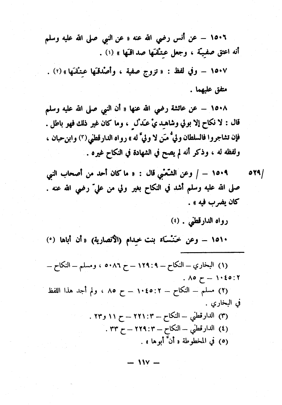 1508- عن عائشة، رضي الله عنها، أن النبي صلى الله عليه وسلم قال: "لا نكاح إلا بولي وشاهديْ عَدْلٍ، وما كان غير ذلك فهو باطل. فإن تشاجروا فالسلطان وليُّ مَن لا وليَّ له". رواه الدارقطني 3 وابن حبان، ولفظه له، وذكر أنه لم يصح في الشهادة في النكاح غيره.