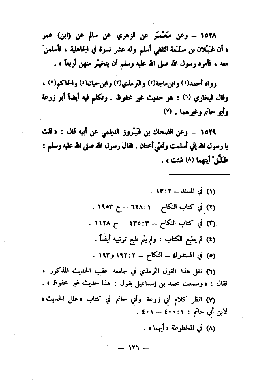 1528- وعن مَعْمَر عن الزهري عن سالم عن (ابن) عمر: "أن غَيْلان بن سَلَمة الثقفي أسلم وله عشر نسوة في الجاهلية، فأسلمنَ معه، فأمره رسول الله صلى الله عليه وسلم أن يتخيّر منهن أربعاً". رواه أحمد 1 وابن ماجة 2 والترمذي 3 وابن حبان 4 والحاكم. 5 وقال البخاري: 6 هو حديث غير محفوظ، وتكلم فيه أيضاً أبو زرعة وأبو حاتم وغيرهما 7.