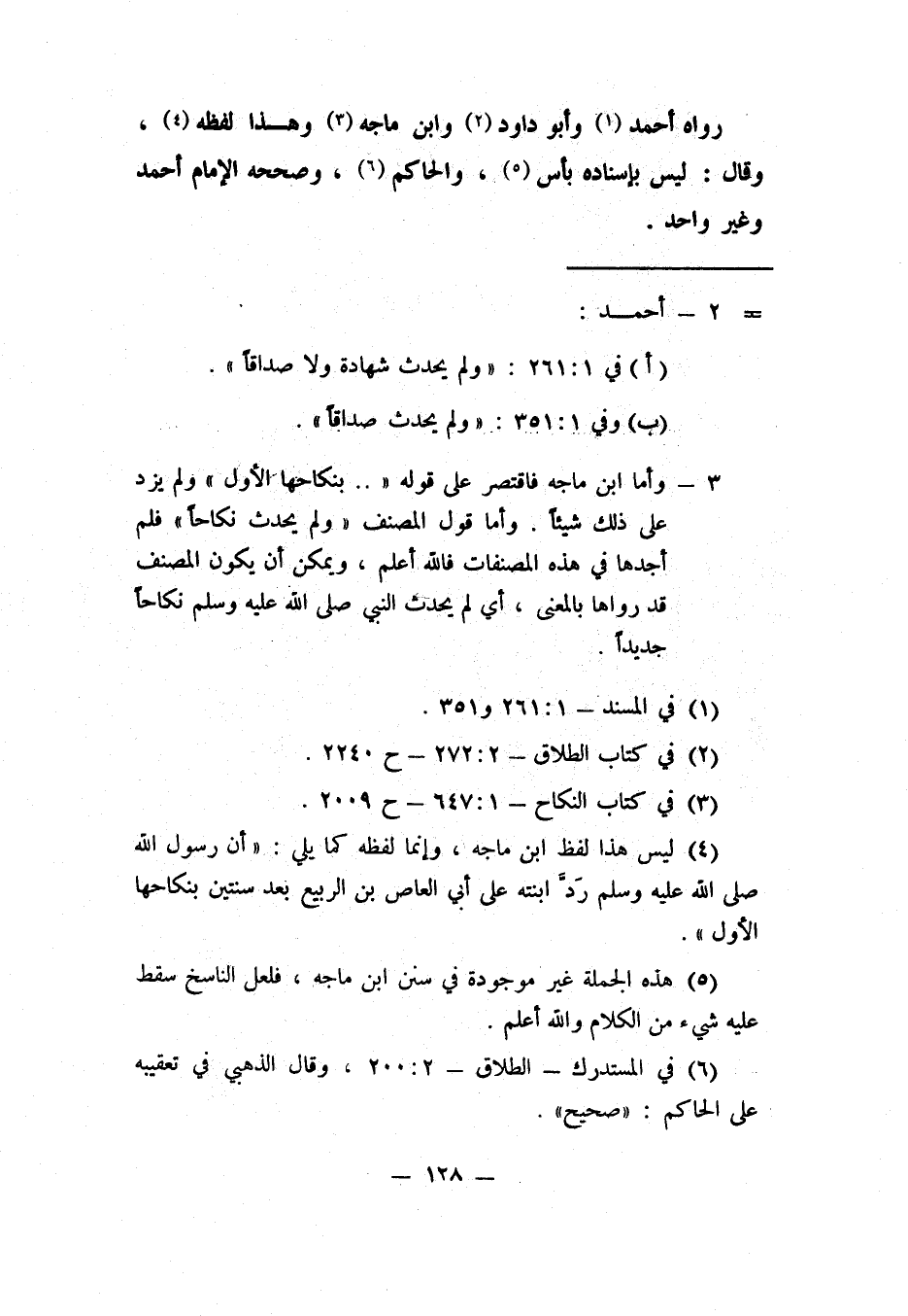 4 ليس هذا لفظ ابن ماجة, إنما لفظه كما يلي: " إن رسول الله ? رد ابنته على أبي العاص بن الربيع بعد سنتين بنكاحها الأول ".