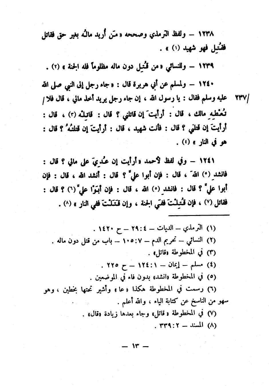 1241- وفي لفظ لأحمد: "أرأيت إن عُدي على مالي؟ قال: فانشد 5 الله. قال: فإن أبَوْا علي؟ قال: أنشد الله. قال: فإن أبوْا عليَّ؟ قال: فانشد 6 الله. قال: فإن أبوْا علي؟ 7 قال: فقاتِلْ، 8 فإن قُتلت ففي الجنة، وإن قَتلت ففي النار " 9