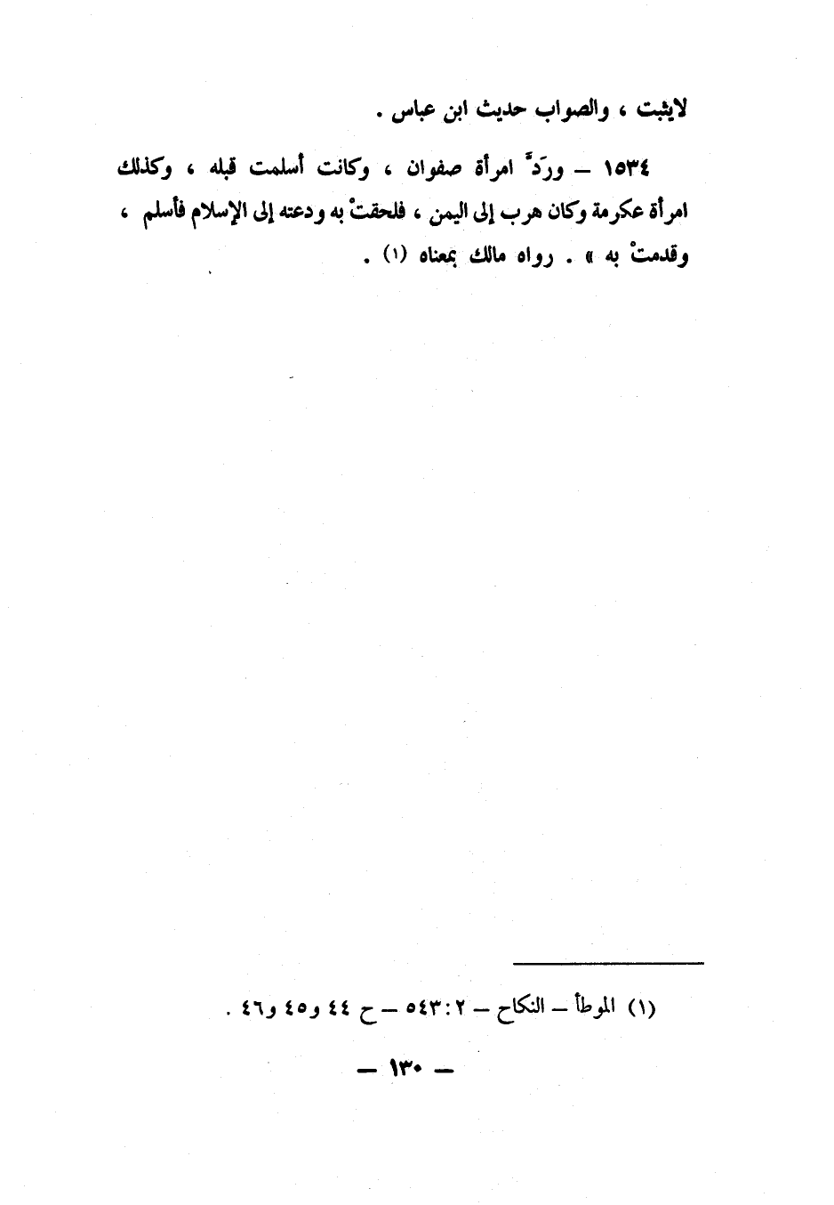 1534- "ورَدَّ امرأة صفوان، وكانت أسلمت قبله، وكذلك امرأة عكرمة وكان هرب إلى اليمن، فلحقتْ به ودعتْه إلى الإسلام فأسلم، وقدمتْ به". رواه مالك بمعناه 1.