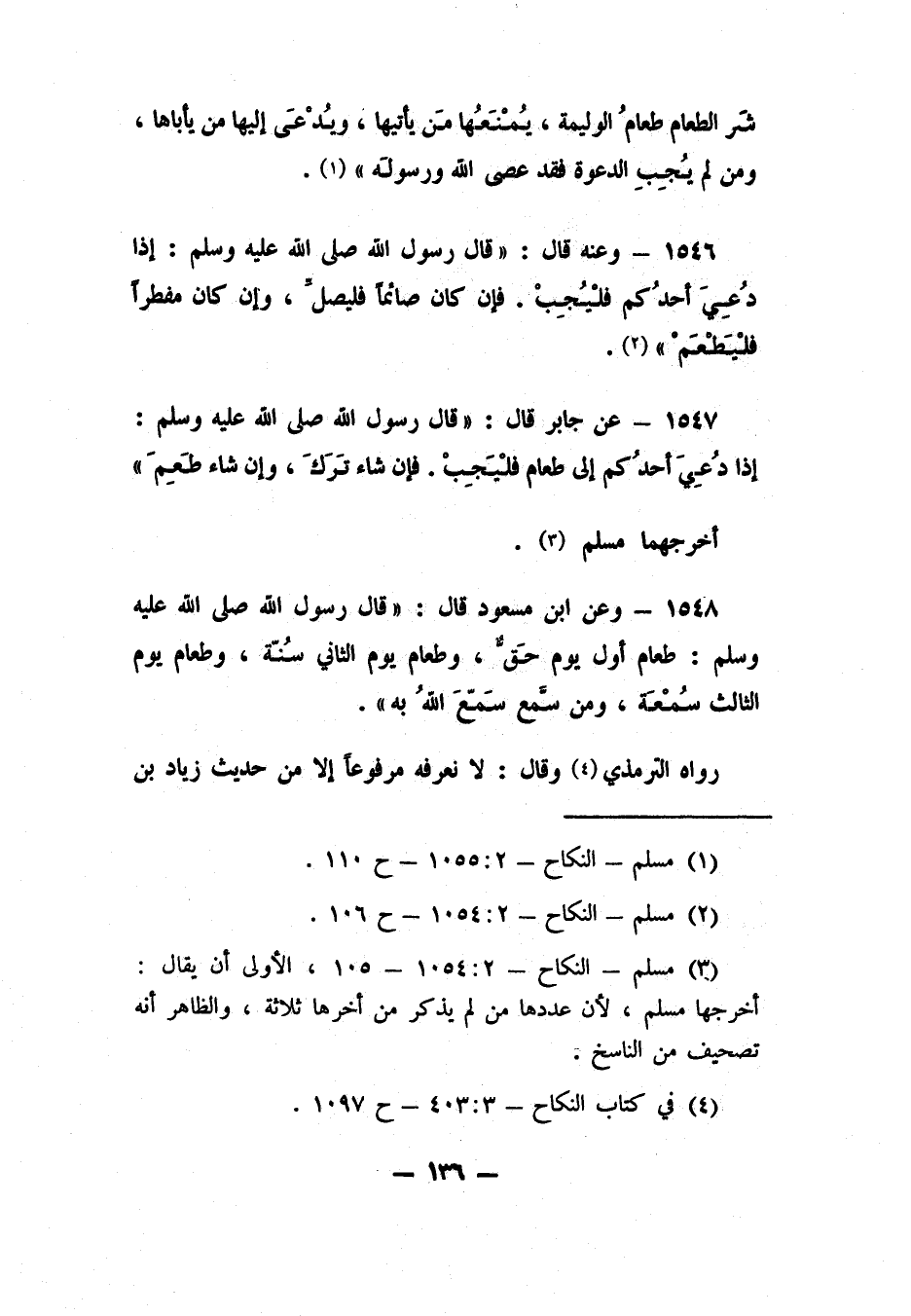 1547- عن جابر قال: قال رسول الله صلى الله عليه وسلم: " إذا دُعي أحدُكم إلى طعام فليجبْ. فإن شاء تَرَكَ، وإن شاء طَعِمَ". أخرجهما مسلم 3.