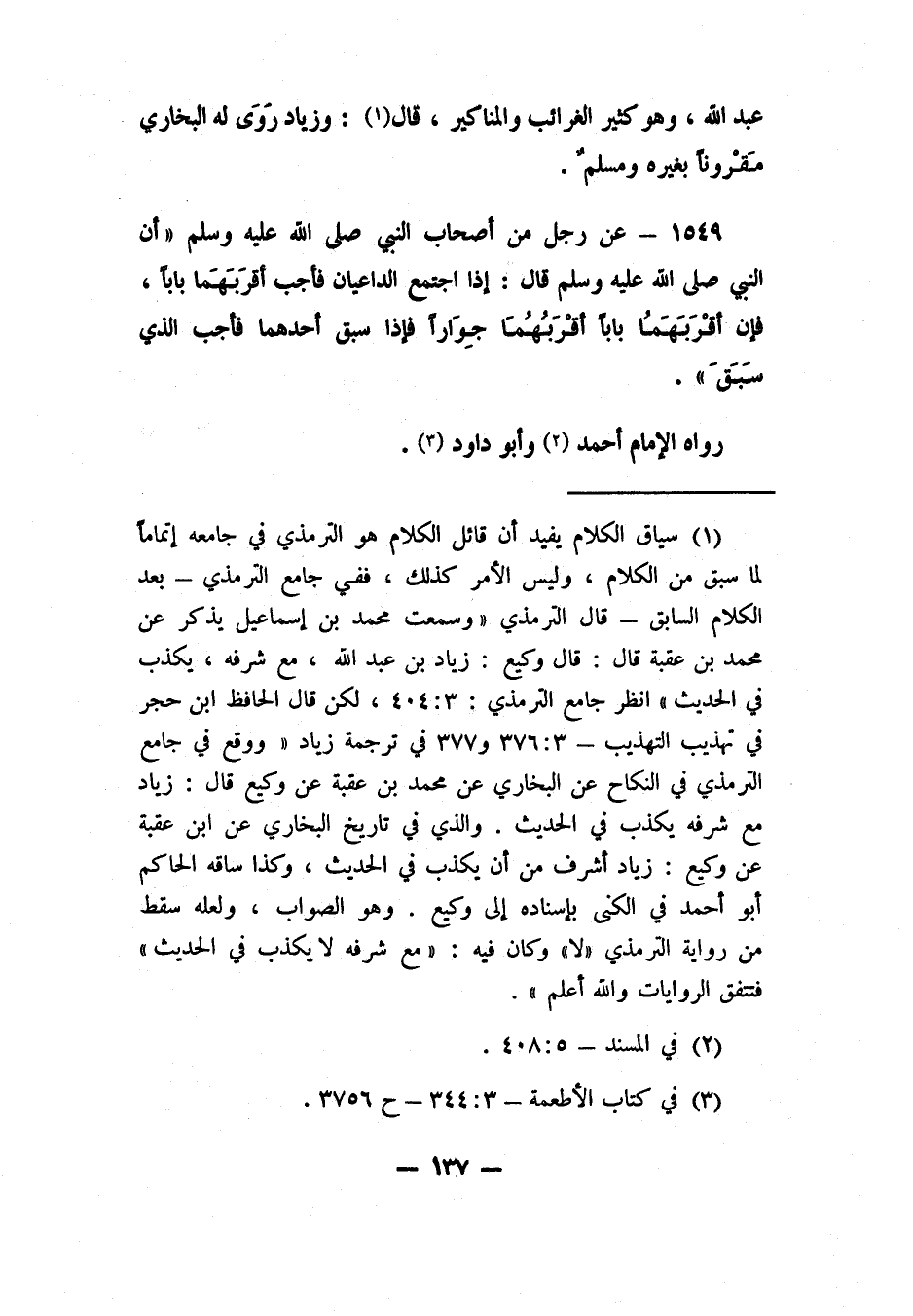 1549- عن رجل من أصحاب النبي صلى الله عليه وسلم أن النبي صلى الله عليه وسلم قال: "إذا اجتمع الداعيان، فأجب أقرَبَهمَا باباً؛ فإن أقْرَبَهُمَا باباً أقْرَبُهُمَا جِوَاراً. فإذا سبق أحدهما، فأجب الذي سَبَقَ". رواه الإمام أحمد 2 وأبو داود 3.