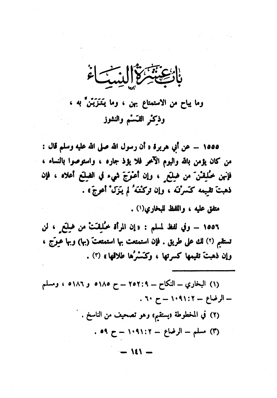 1555- عن أبي هريرة أن رسول الله صلى الله عليه وسلم قال: "من كان يؤمن بالله واليوم الآخر، فلا يؤذ جاره. واستوصوا بالنساء؛ فإنهن خُلقن من ضِلَعٍ، وإن أعْوَجَ شيء في الضِلَع أعلاه، فإن ذهبتَ تقِيمه كسرتَه، وإن تركْتَهُ لم يَزَلْ أعوجَ". متفق عليه، واللفظ للبخاري 1.