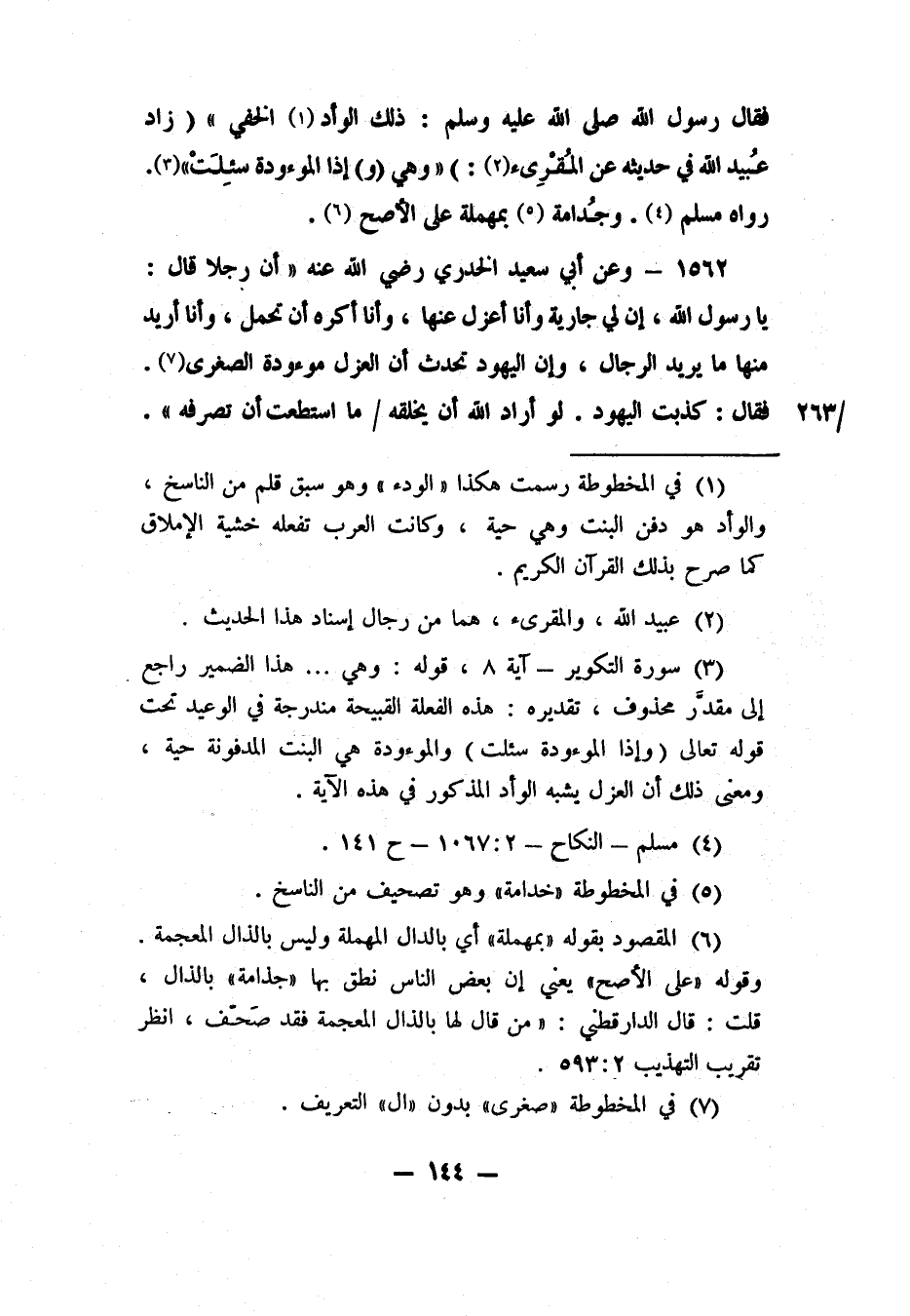 1562- وعن أبي سعيد الخدري رضي الله عنه: "أن رجلا قال: يا رسول الله، إن لي جارية وأنا أعزل عنها، وأنا أكره أن تحمل، وأنا أريد منها ما يريد الرجال. وإن اليهود تحدث أن العزل موؤودة الصغرى. 7 فقال: كذبت اليهود، لو أراد الله أن يخلقه ما استطعت أن تصرفه".