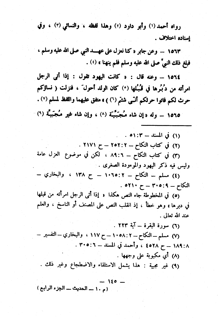 1563- وعن جابر: "كنا نعزل على عهد النبي صلى الله عليه وسلم، فبلغ ذلك النبي صلى الله عليه وسلم فلم ينهنا" 4.