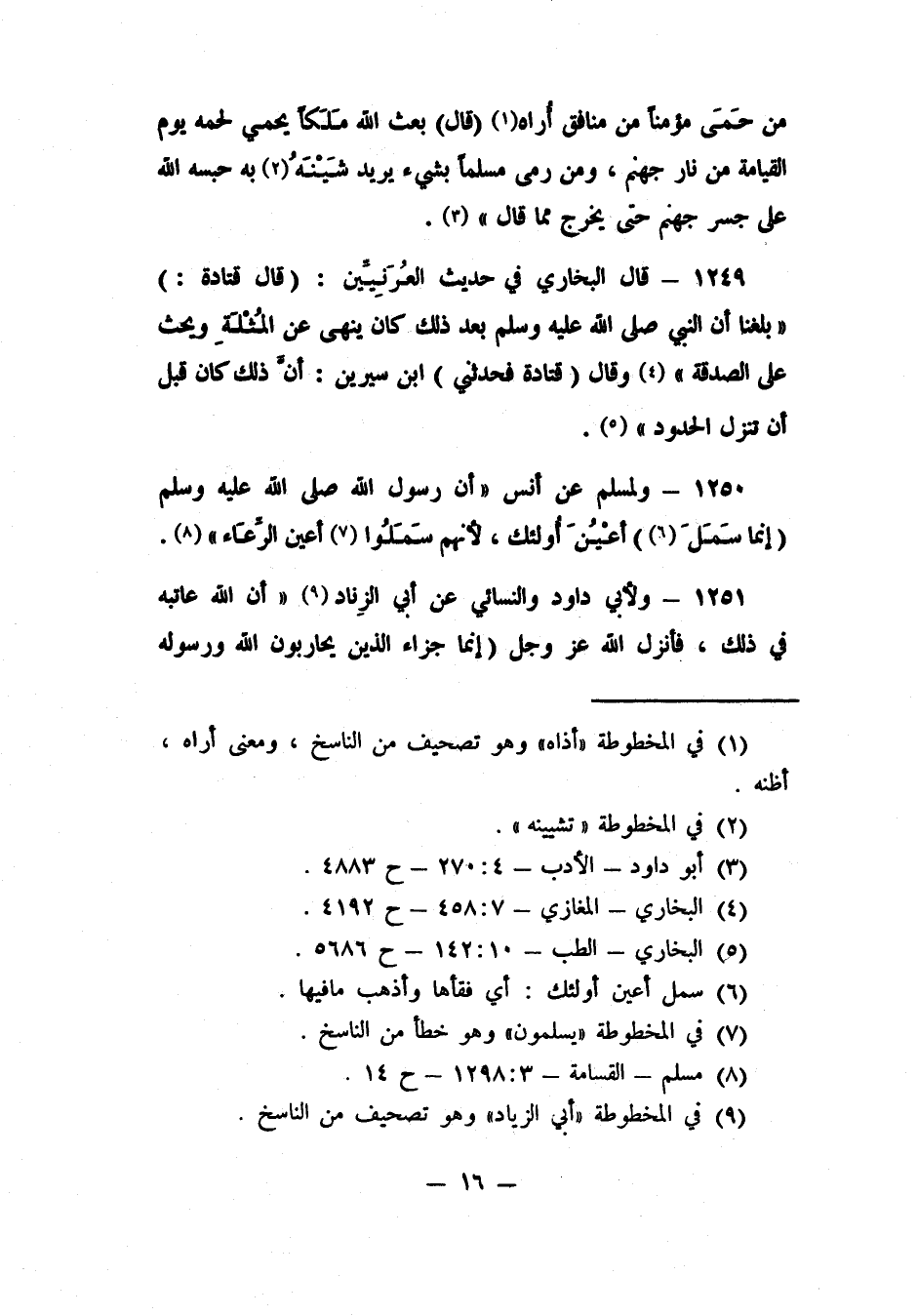 1250- ولمسلم عن أنس: "أن رسول الله صلى الله عليه وسلم إنما سَمَلَ 6 أعْيُنَ أُولئك، لأنهم سَمَلُوا 7 أعين الرِّعَاء" 8.