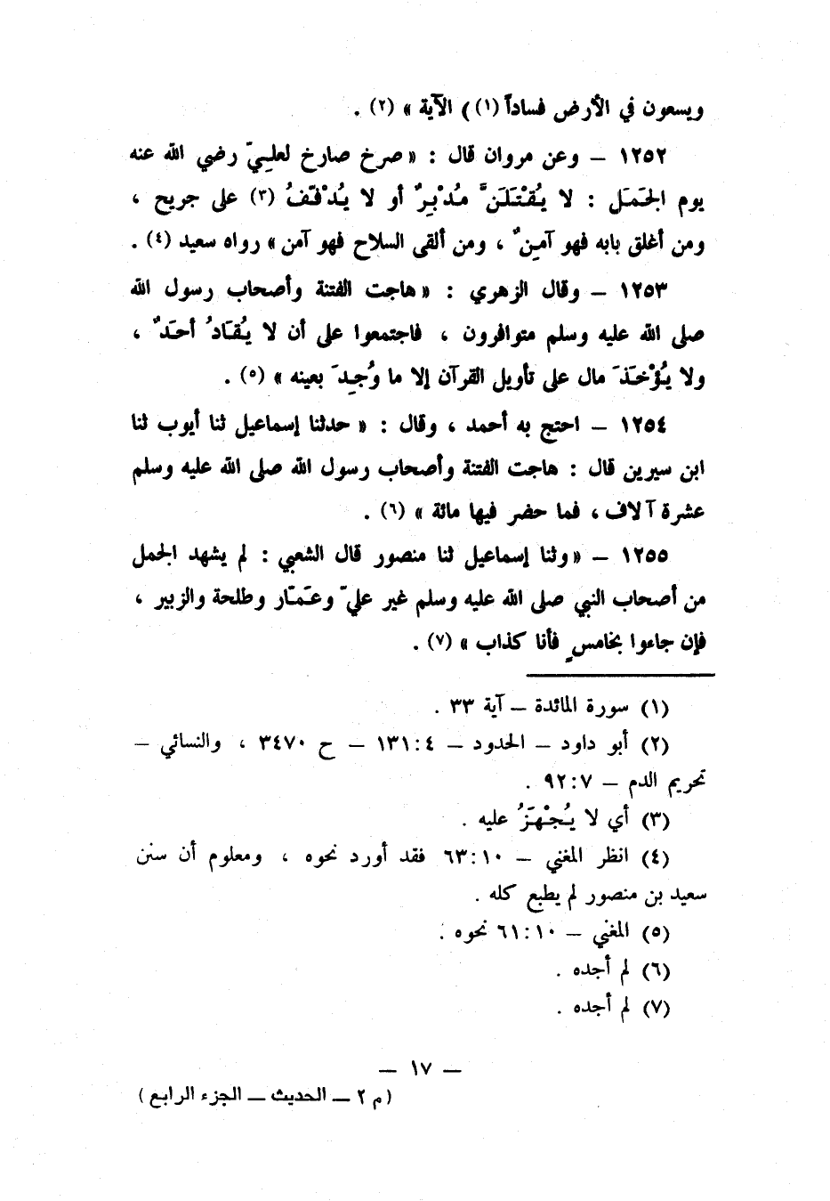 1252- وعن مروان قال: "صرخ صارخ لعلي رضي الله عنه يوم الجمل: لا يُقْتَلَن مدبر، ولا يذفف 2 على جريح. ومن أغلق بابه فهو آمن. ومن ألقى السلاح فهو آمن". رواه سعيد 3.
