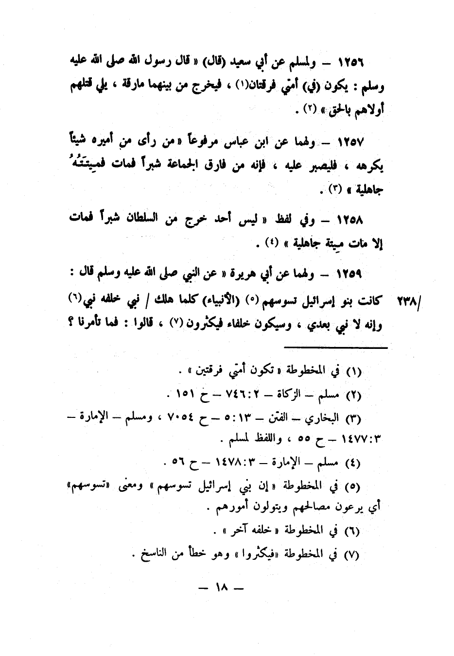 1258- وفي لفظ: "ليس أحد خرج من السلطان شبراً فمات، إلا مات مِيتة جاهلية" 4.